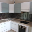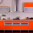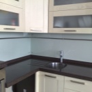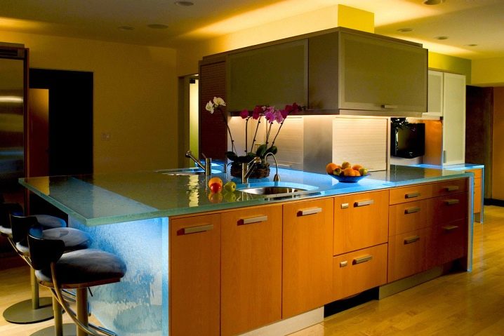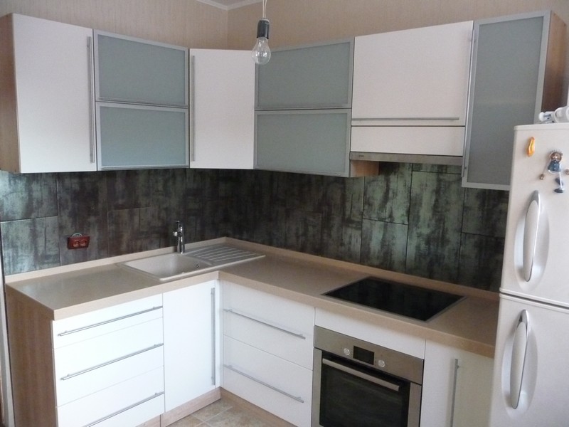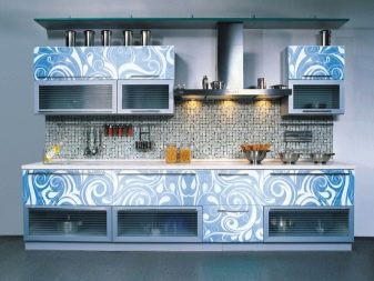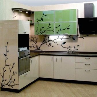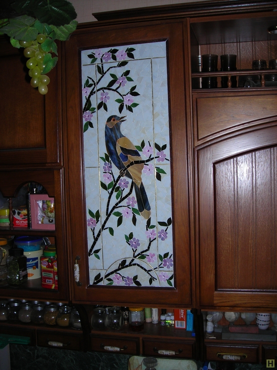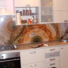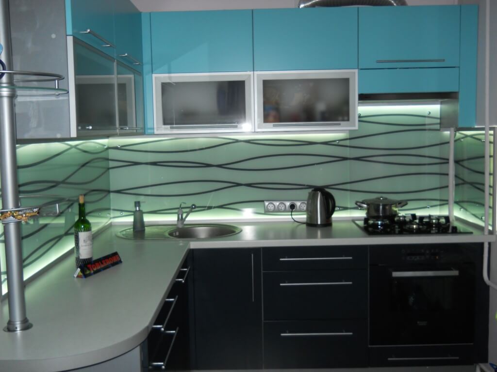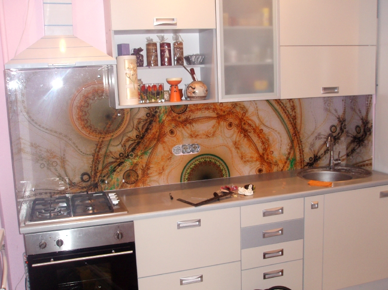 Glasfassaden in der Küche mit der Sintertechnik, also Fusing, machen es ungewöhnlich. Dies ist eine neue Design-Technologie von Glasmalerei in einem modernen Stil, in dem kleine Stücke von mehrfarbigem Glas auf einer transparenten Glasplatte in einem bestimmten Muster platziert werden. Danach werden sie zur Wärmebehandlung in den Ofen geschickt und erhalten ihre Arbeit in Farbe.