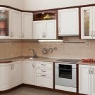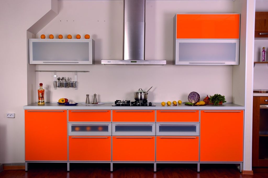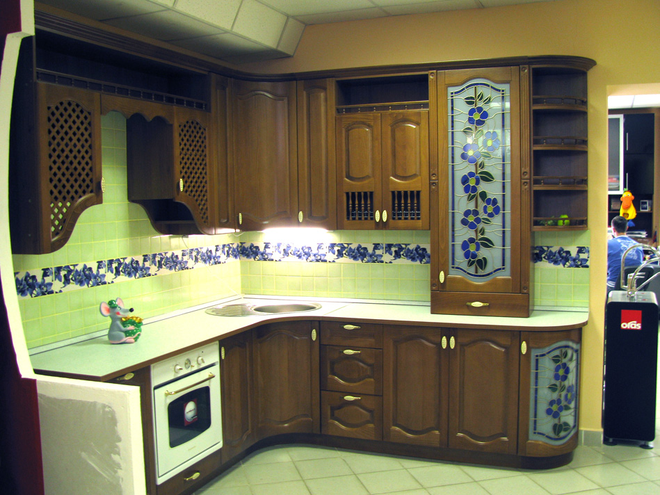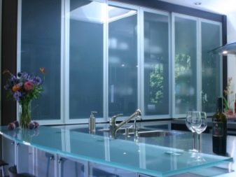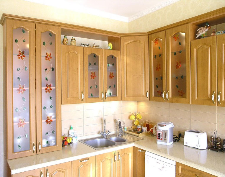 Eines der sehr teuren Produkte sind gebogenes Glas mit Dekor und Sputtern. Küchenschränke mit Glasmalerei werden auch teuer, wenn die Fassade aus verschiedenen farbigen Stücken besteht.