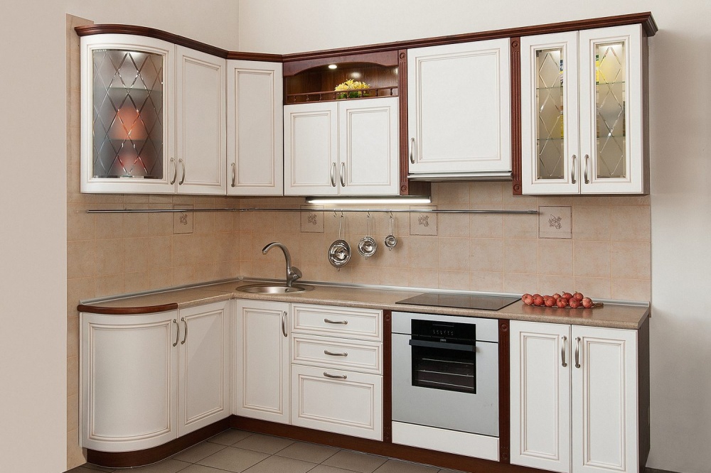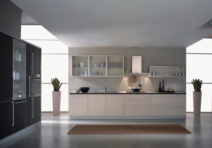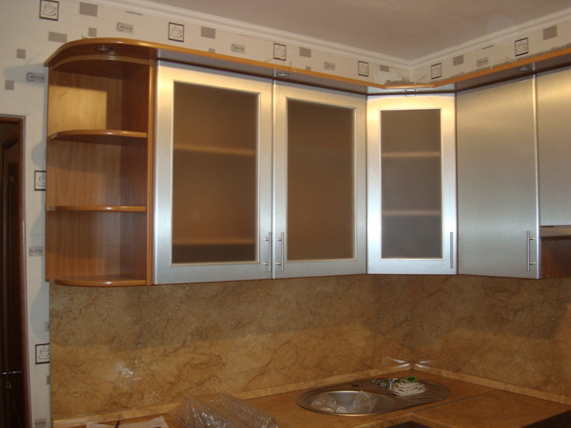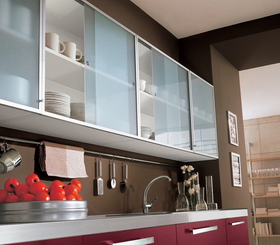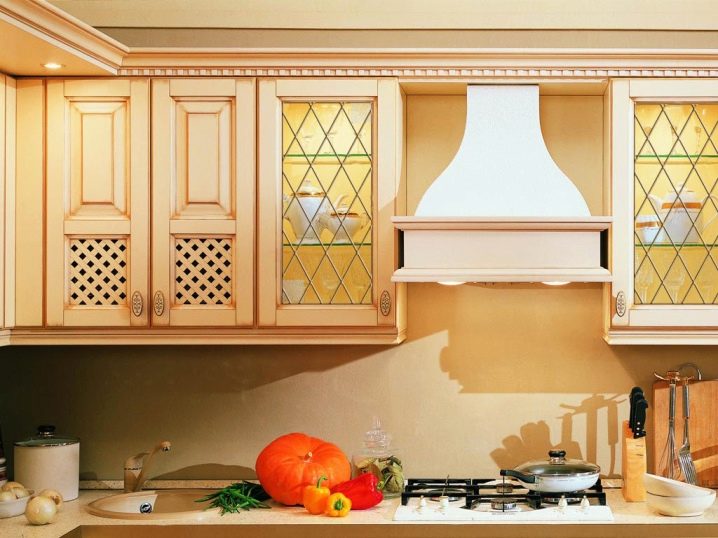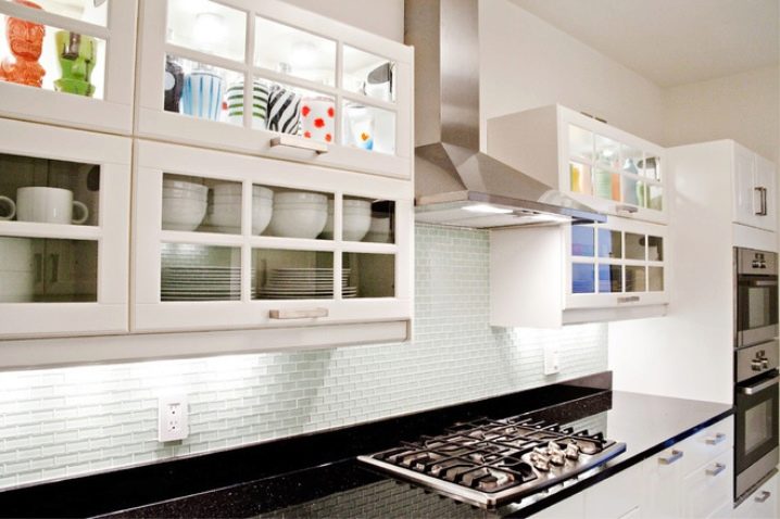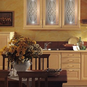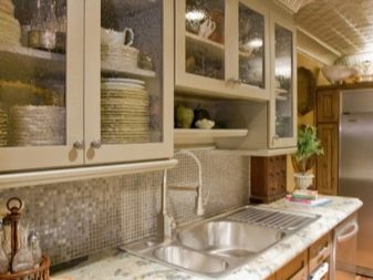 Um dem Innenraum eine besondere Raffinesse zu geben, wird das Set mit Glasfassaden helfen. Dies ist ein ausgezeichneter Ersatz für geschlossene Küchenschränke, während Staub nicht in den Schränken vorbeigeht, aber es gibt deutlich sichtbare Geschirr und dekorative Gegenstände, die jetzt viel angeboten werden.