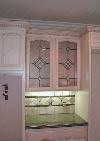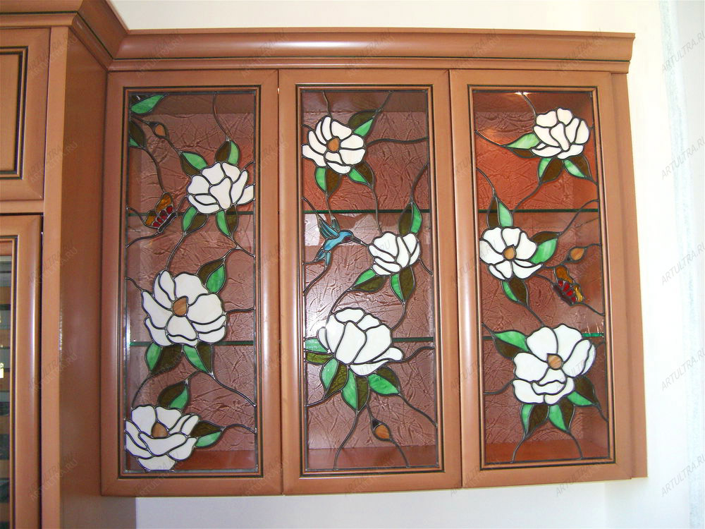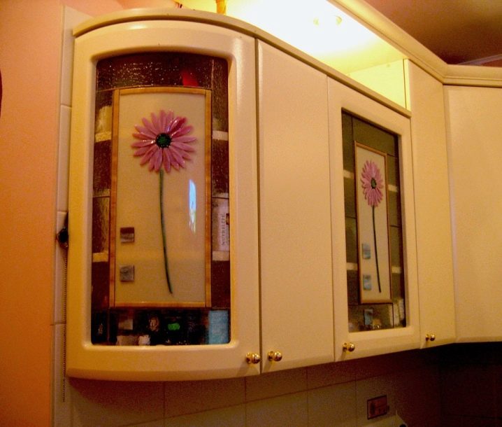 Diese Art von Glas ist Teil der dekorativen Kunst, die in modernen Innenräumen verwendet wird. Mit Buntglas dekorierte Küchenschränke machen jedes Interieur einzigartig.