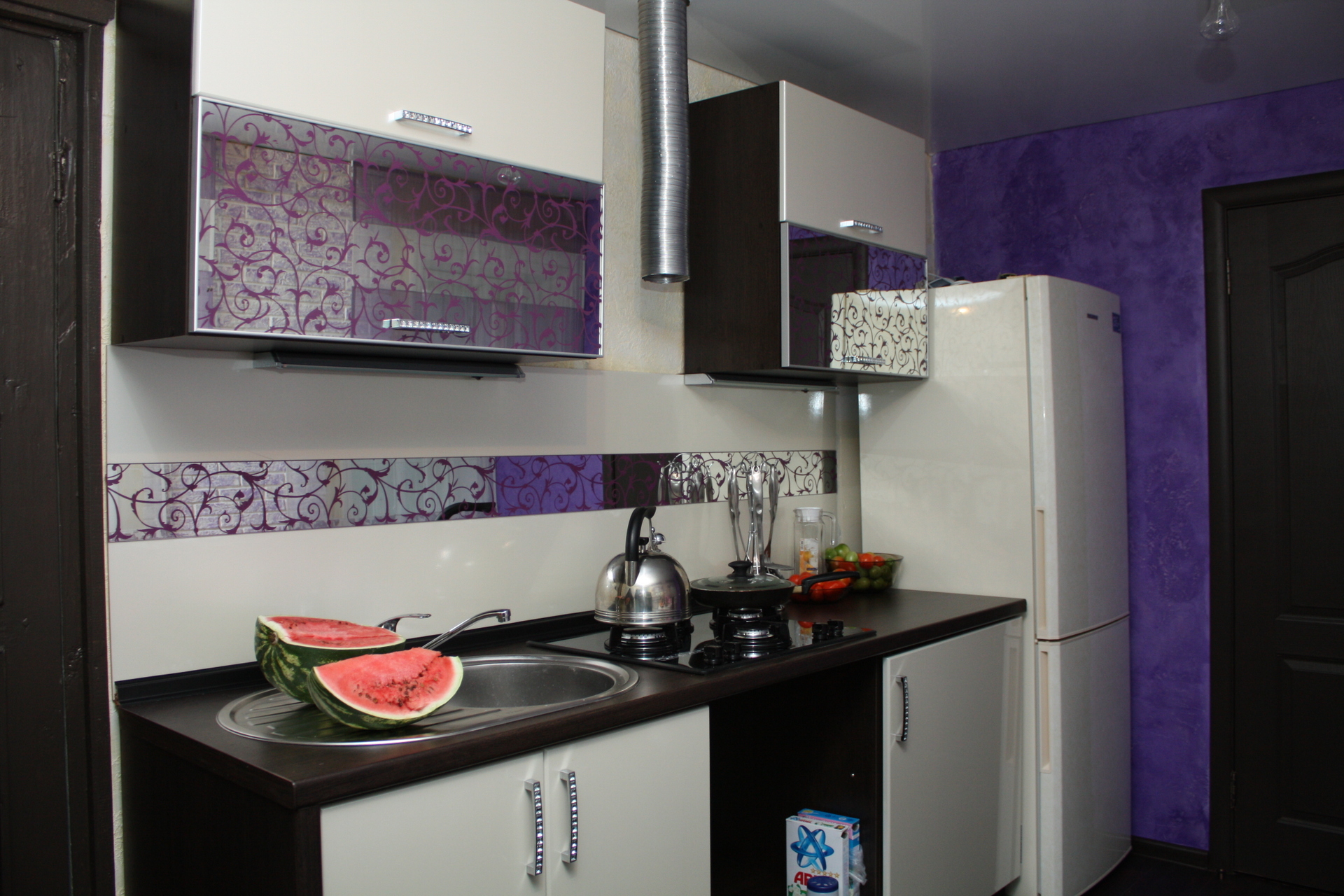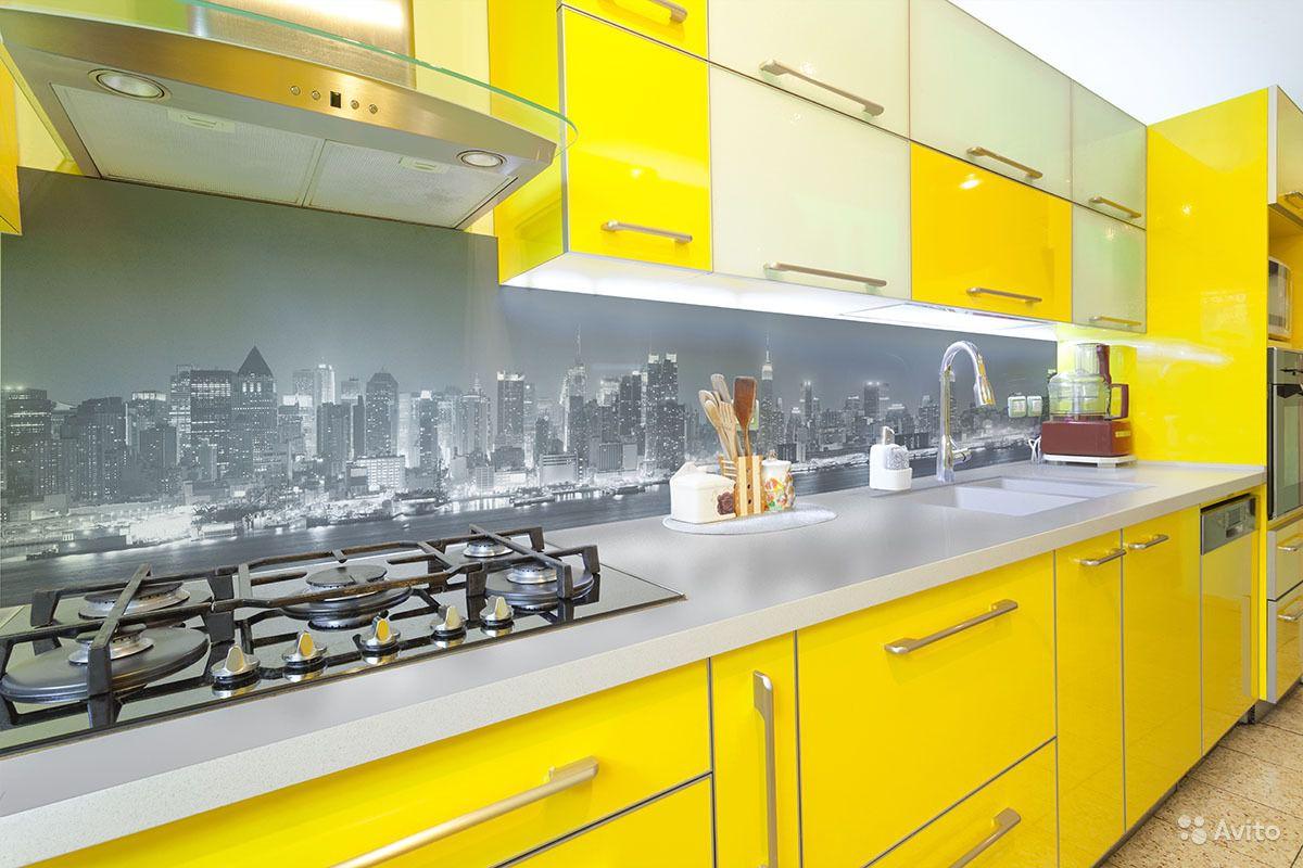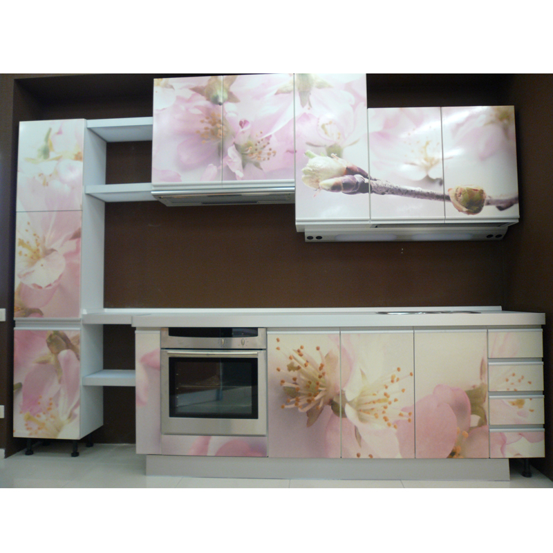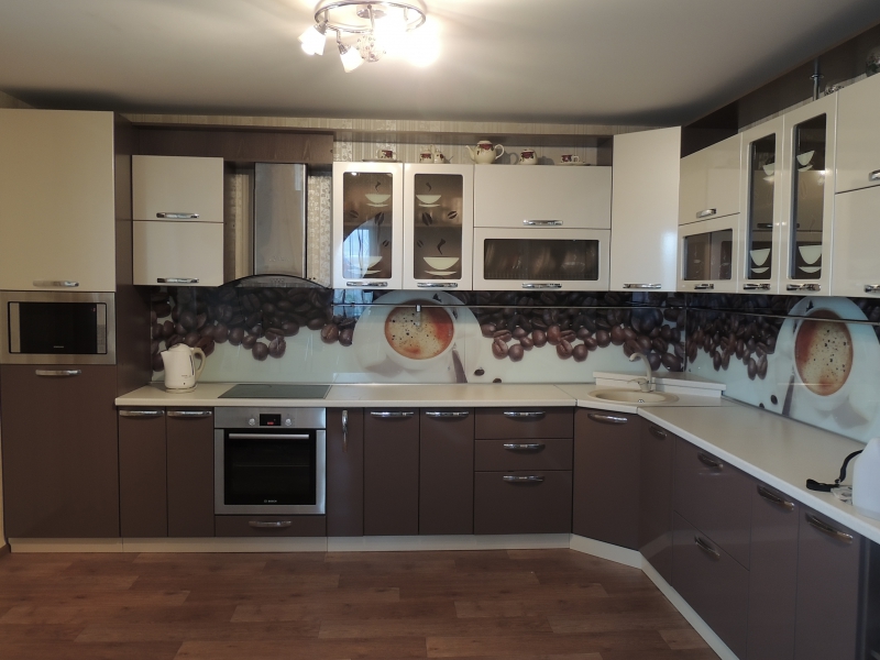 Fotodruck auf Glas wird für das Innere der Schränke in der Küche oben und unten verwendet, was durch die Integration jedes Bildes mit einem Drucker oder Film erreicht wird. Solch eine elegante und schöne Art der Dekoration wird dank Fotodruck erhalten.
