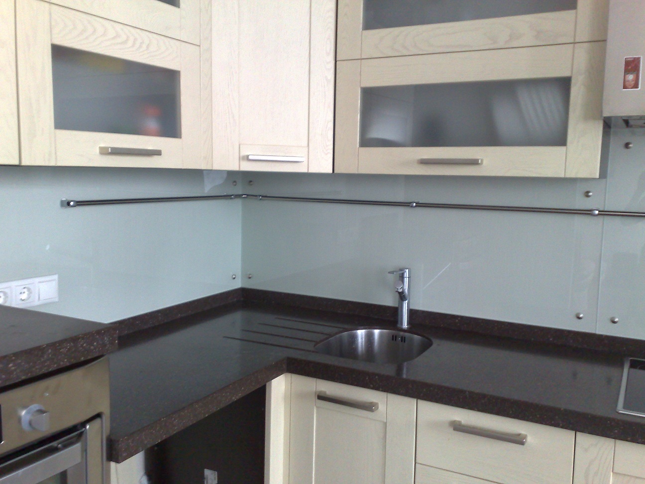 Für die Stärke wählen Sie gehärtetes Glas, obwohl Sie gewöhnlichen oder verzierten nehmen können. Bei der Verwendung von transparentem Glas ist es wichtig zu berücksichtigen, dass dahinter alles perfekt sichtbar ist, d.h. da muss Ordnung sein. Natürlich muss man einen guten Glasreiniger bekommen.