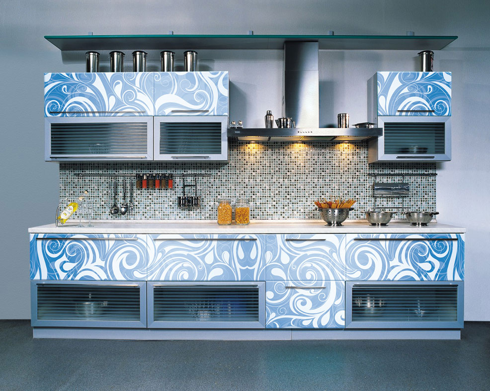 Für den Küchenschrank mit farbigem Glas oder farbigem Film, aus dem jedes Bild entsteht. In dieser Form sehen die Möbel interessanter aus als bei Standard-Klarglas. Farbe kann für jeden Geschmack gewählt werden.