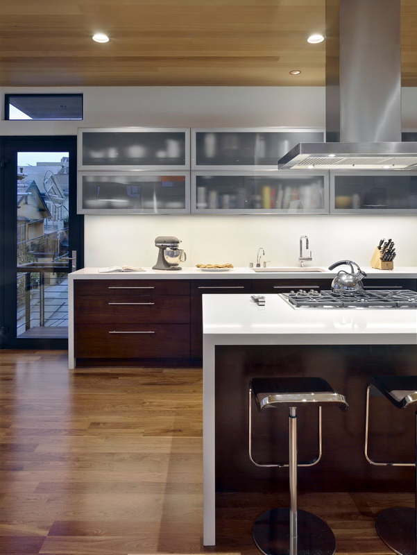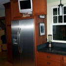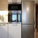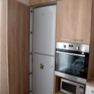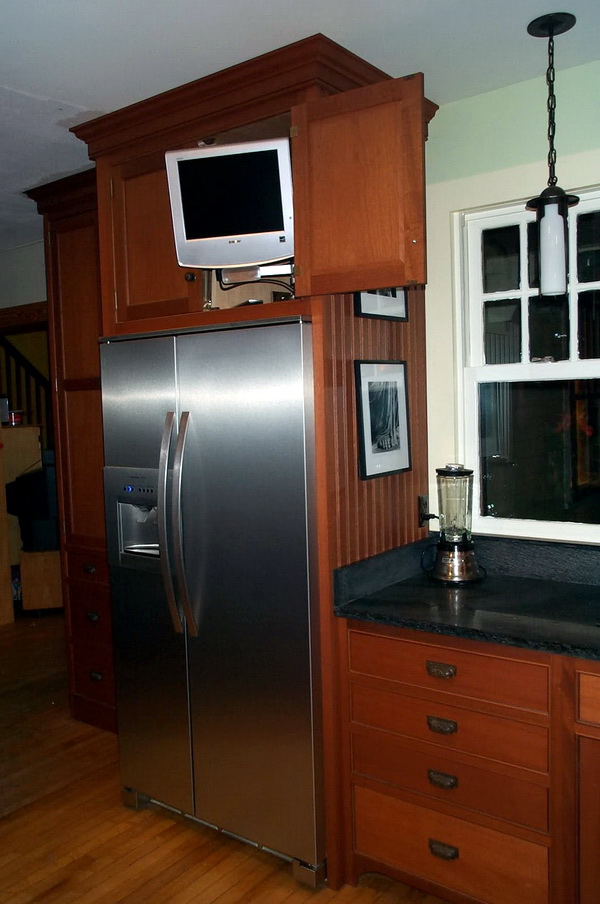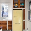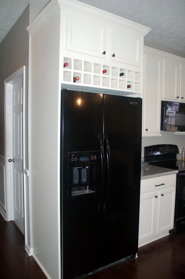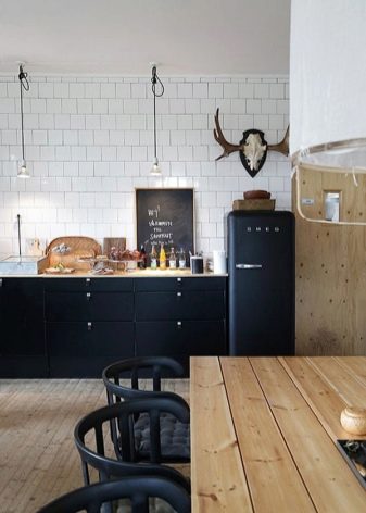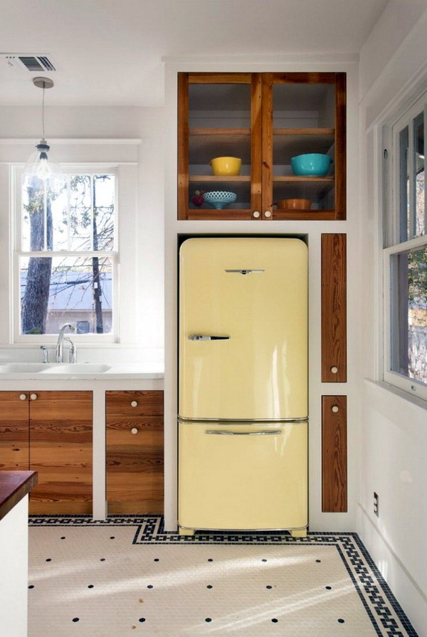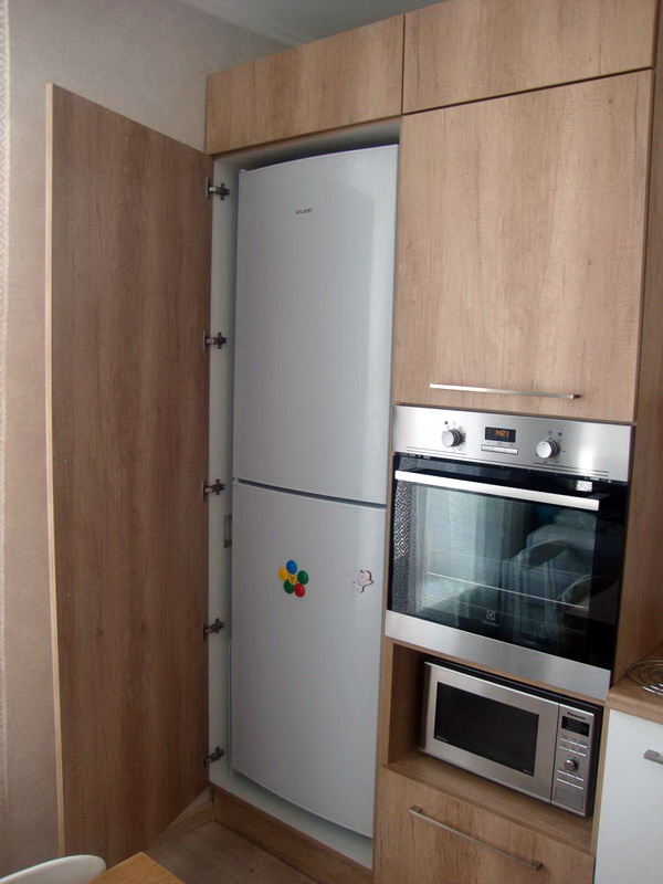 Es gibt keine Probleme mit dem eingebauten Kühlschrank, sie erscheinen, wenn Sie es in Standardgrößen haben und Sie müssen es harmonisch in das Gesamtdesign einfügen. In diesem Fall gibt es einige Designtechniken, die die Situation retten können. Als Option wird ein Klappschrank über dem Kühlschrank installiert, so dass die gesamte Horizontlinie gleich wird. Eine andere Möglichkeit besteht darin, die Höhe der gesamten oberen Reihe der Höhe des Kühlschranks anzupassen (natürlich sind Kühlschränke von 2 Metern oder mehr gemeint, obwohl in diesen Fällen die Ausrichtung sehr problematisch ist).