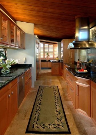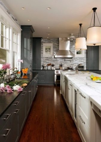 Eine solche Küchenkomponente wird weniger häufig erworben, hauptsächlich für große und geräumige Küchen oder für Schränke, die durch ein individuelles Design hergestellt werden. Das untere Modul unter der Tischplatte wird eine Tiefe von 76 cm haben.Wenn Ihre Küche nicht sehr klein ist, aber mittelgroß ist, ist es nicht empfehlenswert, eine solche Tischplatte zu kaufen. Es wird den Küchenraum visuell stehlen, und es wird sperrig erscheinen, mit einem Schwerpunkt auf der Tischplatte allein.