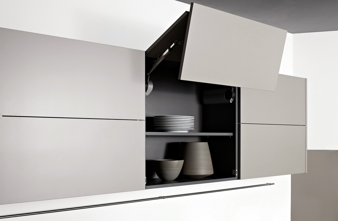 Die Hauptregel für die Position des Klappmoduls ist der Abstand zwischen dem oberen Teil des Bodenschranks und dem Boden des Klappschranks - mindestens 45 cm, so dass alle Haushaltsgeräte kompakt passen und Kopfstücke vermieden werden können, da der obere Schrank viel schmaler als der Boden ist.