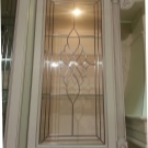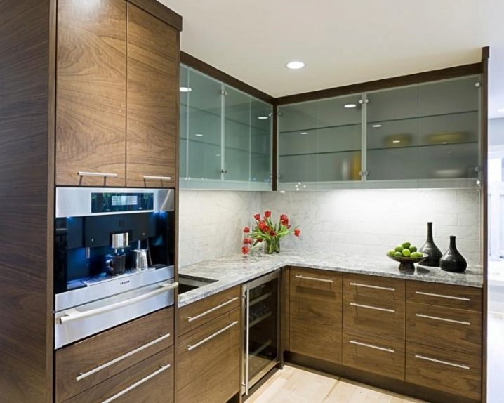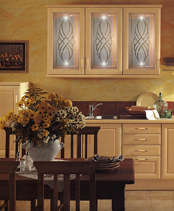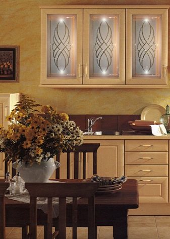 - Geformtes Glas. Glaseinsätze von Küchenschränken können durch Biegetechnik gebogen werden. Solches Glas wird oft in Eckmodellen verwendet. Bilder und Ornamente werden ebenfalls darauf aufgebracht, was einem solchen Schrank einen besonderen Chic verleiht.