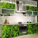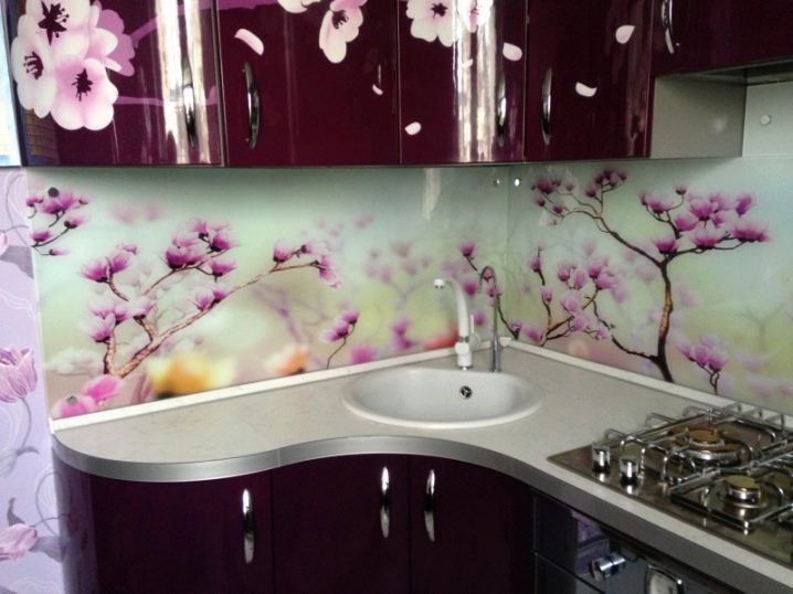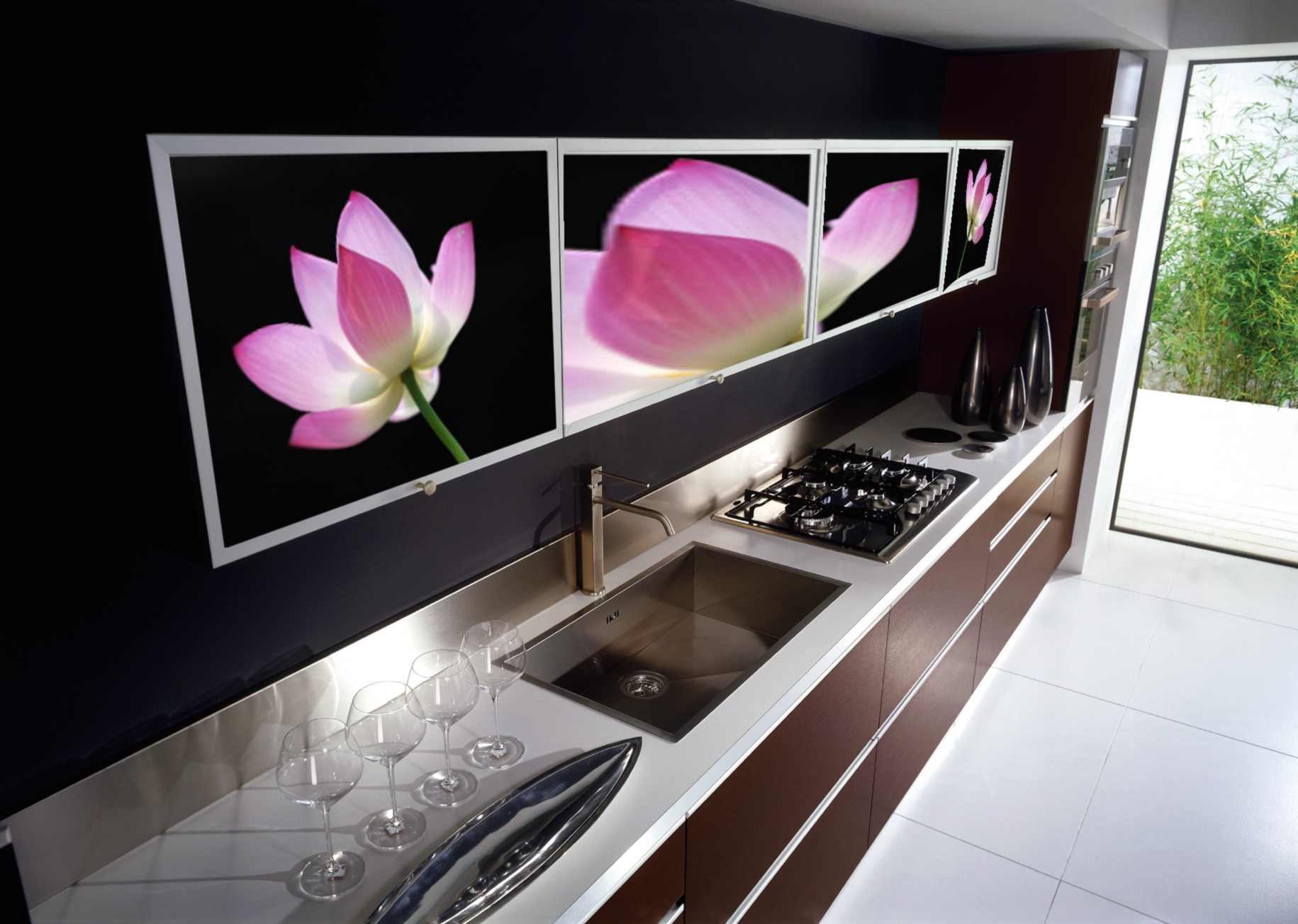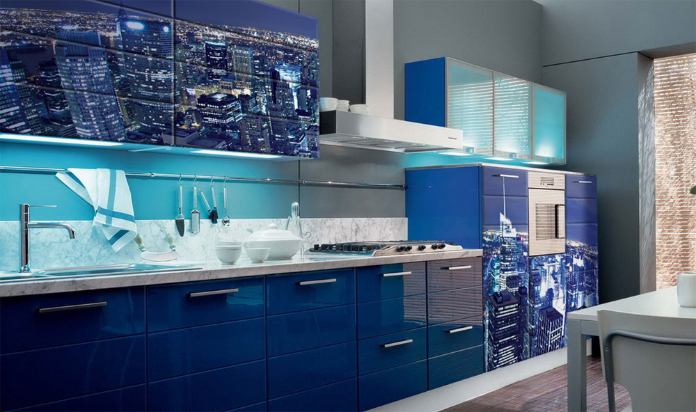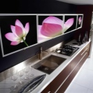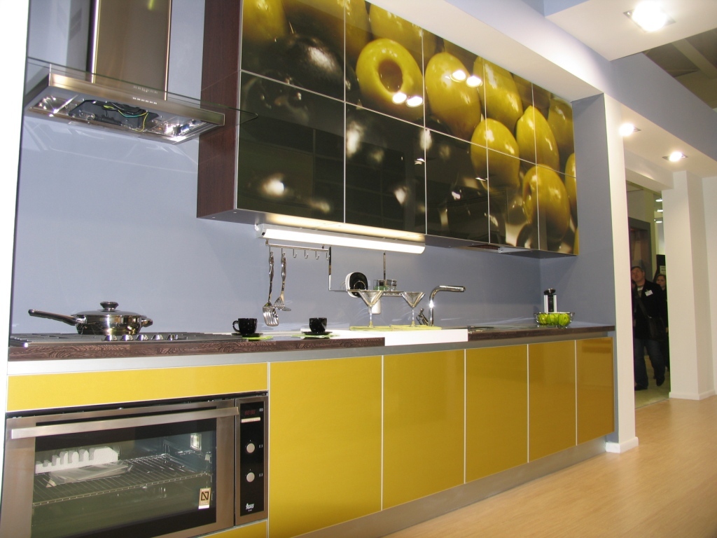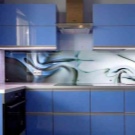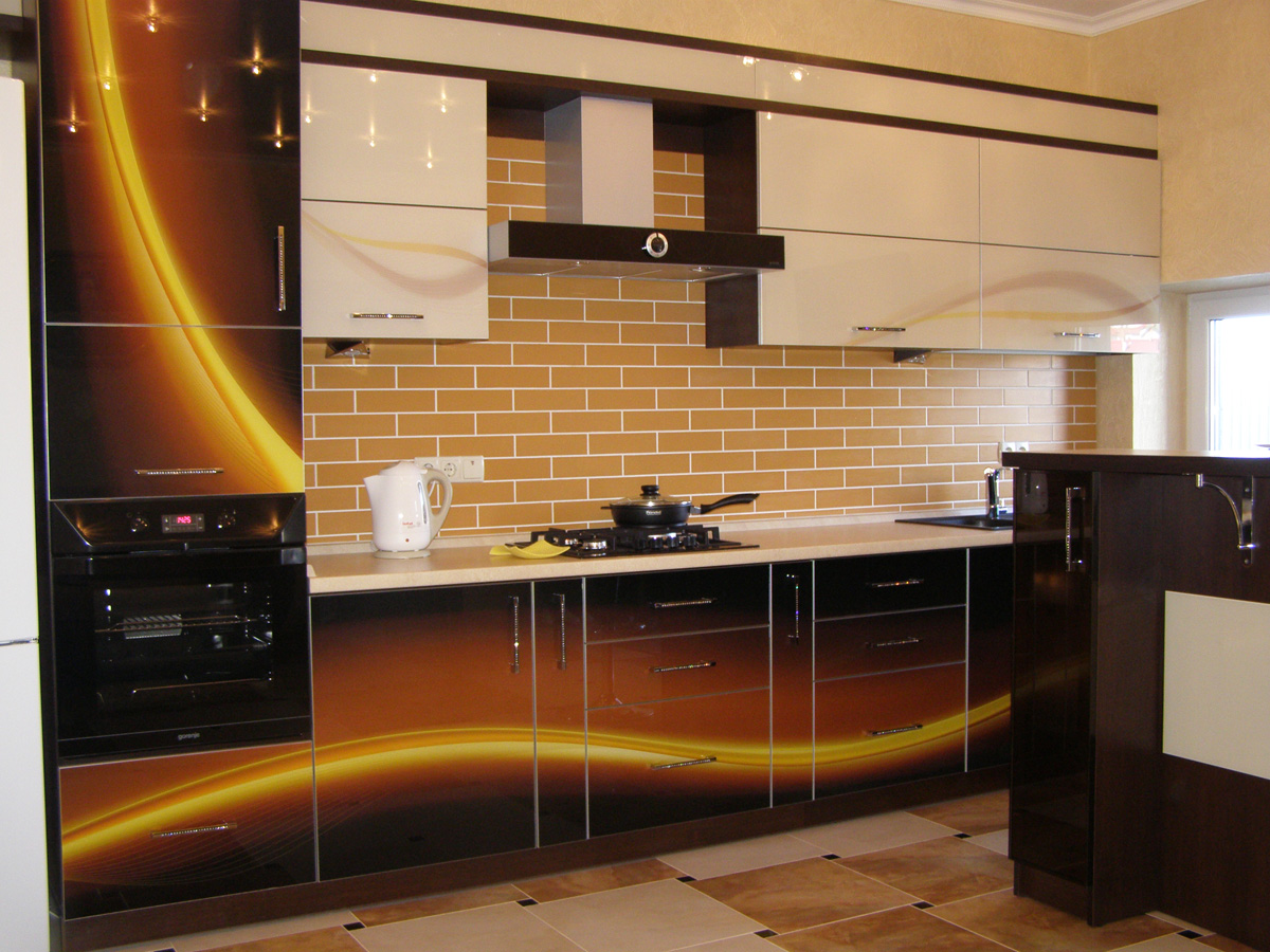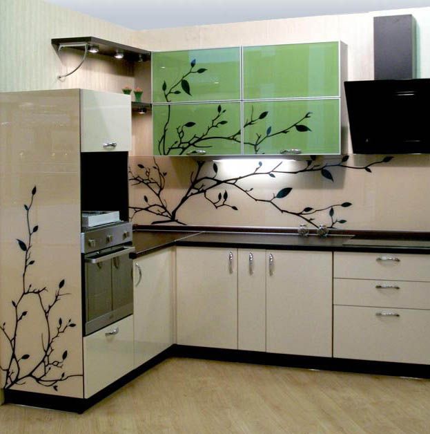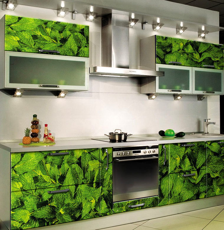 - Farbdruck. Farbdruck auf Glas ist eine Technologie, die es ermöglicht, jedes Kücheninterieur zu beleben.Die Zeichnung wird auf einer Glasoberfläche mit speziellen keramischen Farben aufgetragen. Darüber hinaus wird es durch ultraviolette Strahlen beeinflusst, was zum "Backen" führt. Die letzte Stufe ist die Anwendung von Lack. Die Türen eines solchen Schranks sind sehr stark, es gibt keine Kratzer an ihnen.