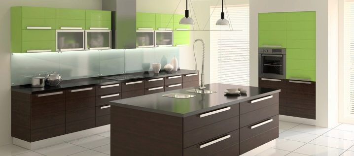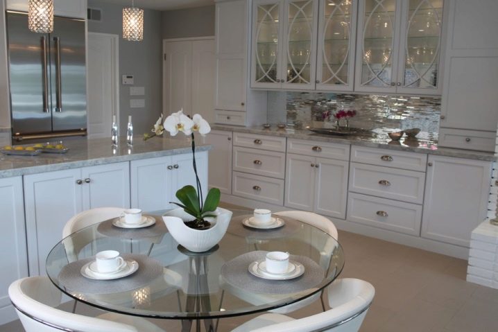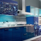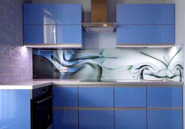 Die Küche mit einer Glasfassade passt in jedes Interieur. Der Hauptvorteil von Glas ist, dass es perfekt mit anderen Materialien kombiniert ist: Aluminium, Holz, MDF.