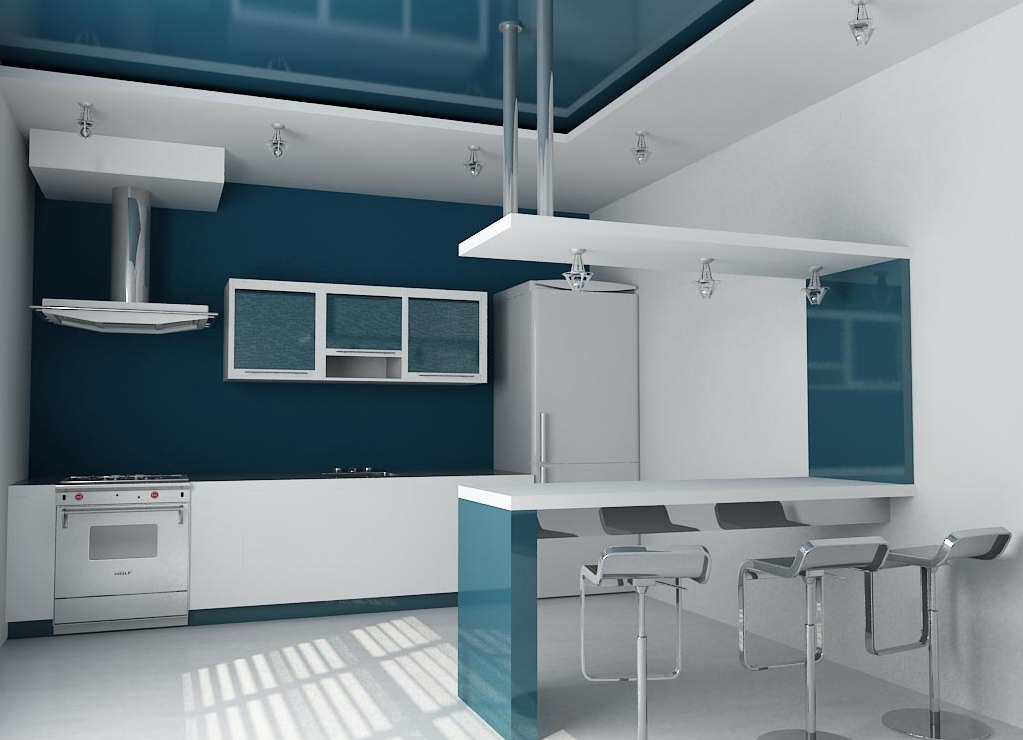 Damit die weiße Farbe in der Küche nicht vorherrschend wird und sie nicht in einen Raum ohne Wärme und Komfort verwandelt, fügen Sie andere Farben und helle Akzente hinzu. Die Fronten aus Milchglas heben sich von den blauen Headset-Schränken ab. Mit einem weichen blauen Textil erhalten wir eine sehr gemütliche und schöne Küche.
