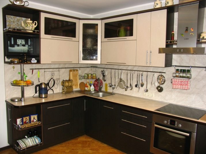 Neben traditionellen Outdoor-Strukturen sind auch diese montiert. Dies ist sehr praktisch, da sie platzsparend über dem Tisch oder Sofa platziert werden können. In hängenden Bordsteinen legen Sie in der Regel eine Vielzahl von Dekorationsartikeln, Sets oder nur das Geschirr, die täglich verwendet werden. In ihnen ist es übrigens sehr bequem, Geschirr zu trocknen.