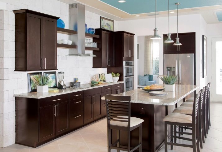 Der Küchenschrank ist praktisch und multifunktional. Es kann als Teil des Arbeitsbereichs, als Ort für das Mittagessen oder als Zone, in der die Ausrüstung installiert ist, verwendet werden. Das Waschbecken, die Waschmaschine oder der Geschirrspüler können in einem Küchenbordstein eingebaut werden.