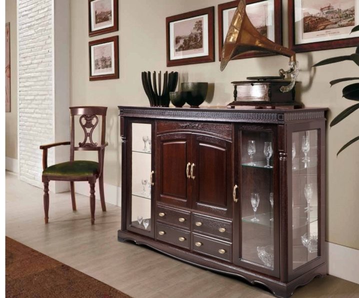 Eine weitere interessante Option - stilvolle Vitrinen. Für ihre Herstellung verwendet ein spezielles gehärtetes Glas, das eine hohe Festigkeit hat. Diese Schränke sehen sehr stilvoll aus und passen perfekt in die modern gestalteten Räume.