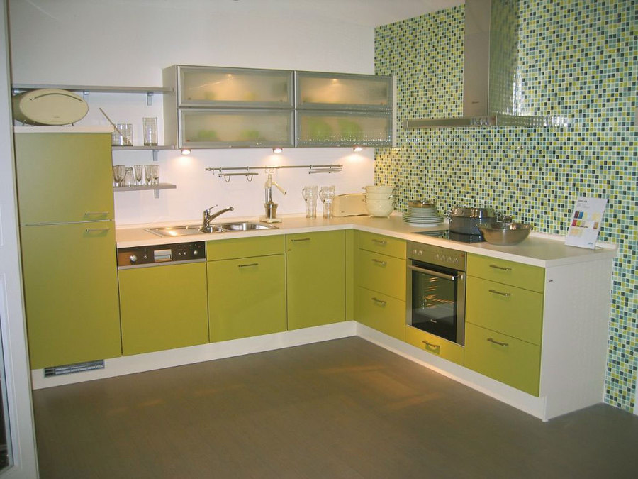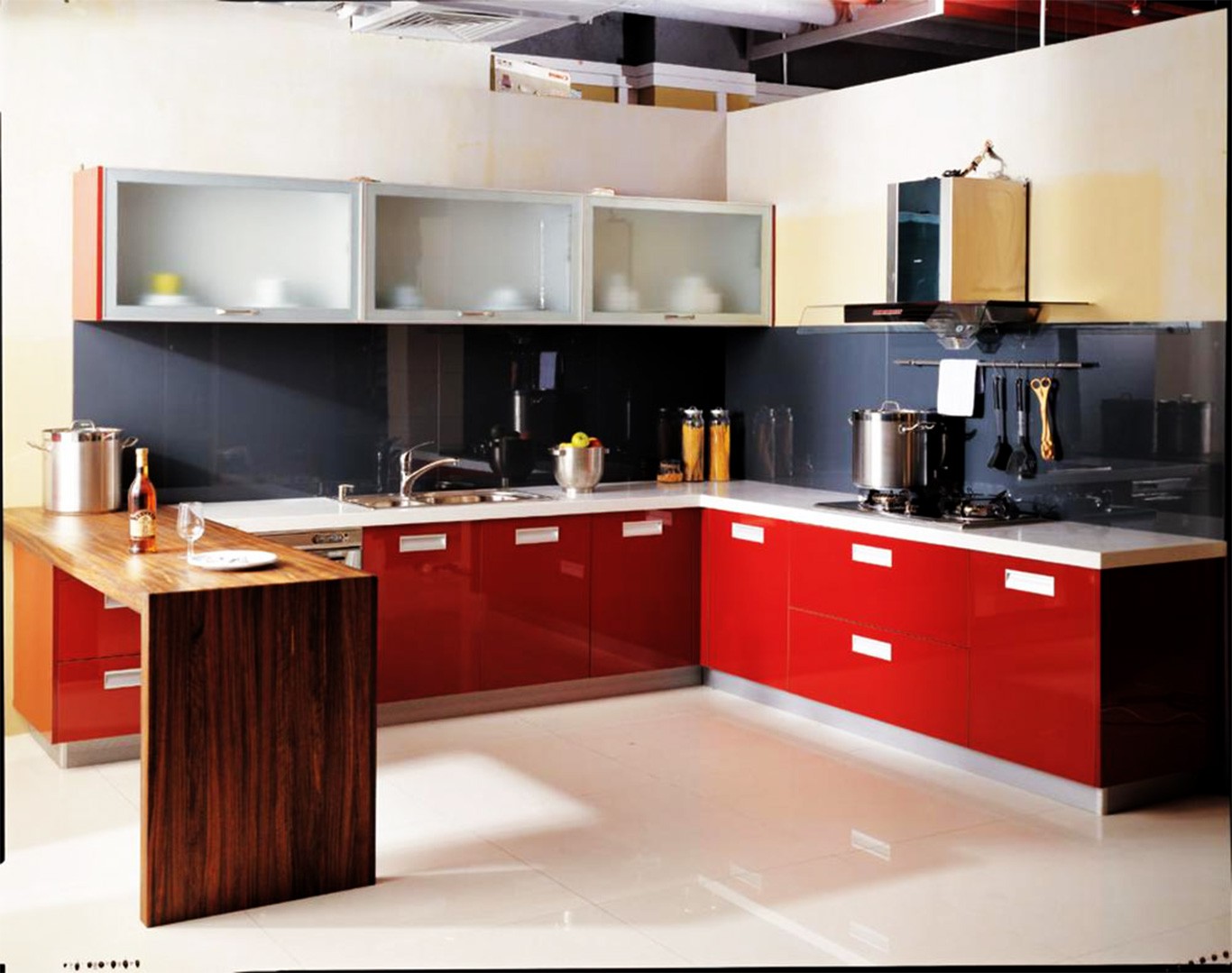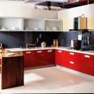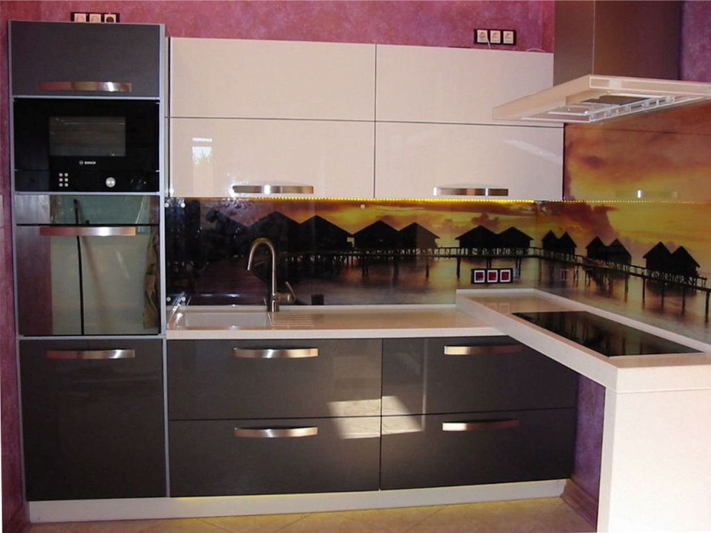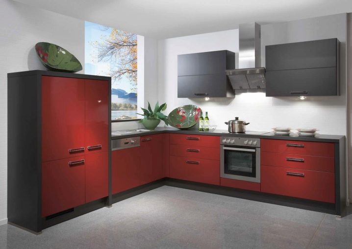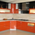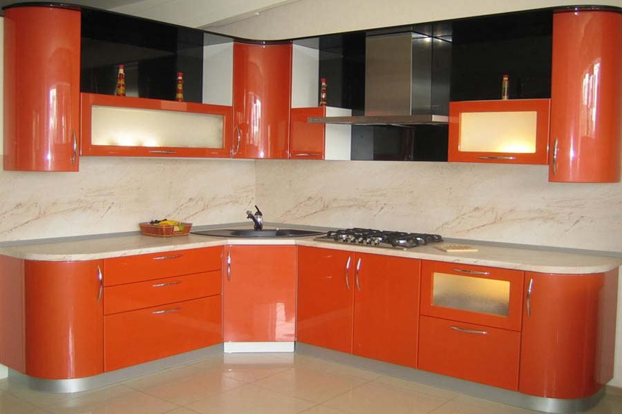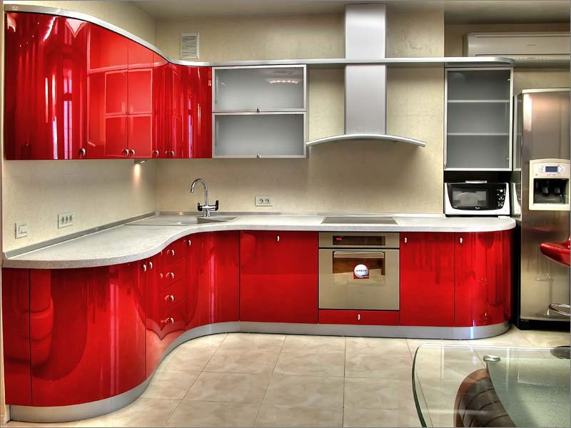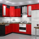 Wenn Sie Wert auf Funktionalität und strenge Linien legen, wird Ihnen die Küchenecke im modernen Stil gefallen. Eckschränke, in einem modernen Stil, passend für jeden Raum, unabhängig von der Gegend. Die Farben werden von leuchtenden Farben dominiert - gelb, rot, blau.