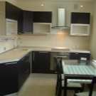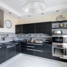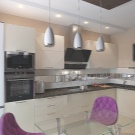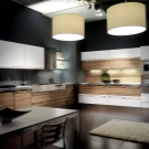 Eine andere Art von Eckküche ist die Halbinsel. Diese Option ist eher für Besitzer geräumiger Räumlichkeiten geeignet. Ein Teil des Headsets befindet sich an der Wand und der andere befindet sich in der Mitte des Raumes im rechten Winkel. Solche Küchen erhöhen die Arbeitsfläche und können sogar als Bartresen dienen.