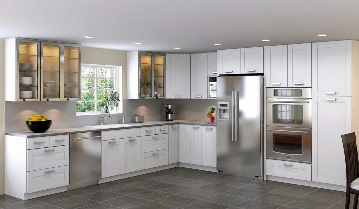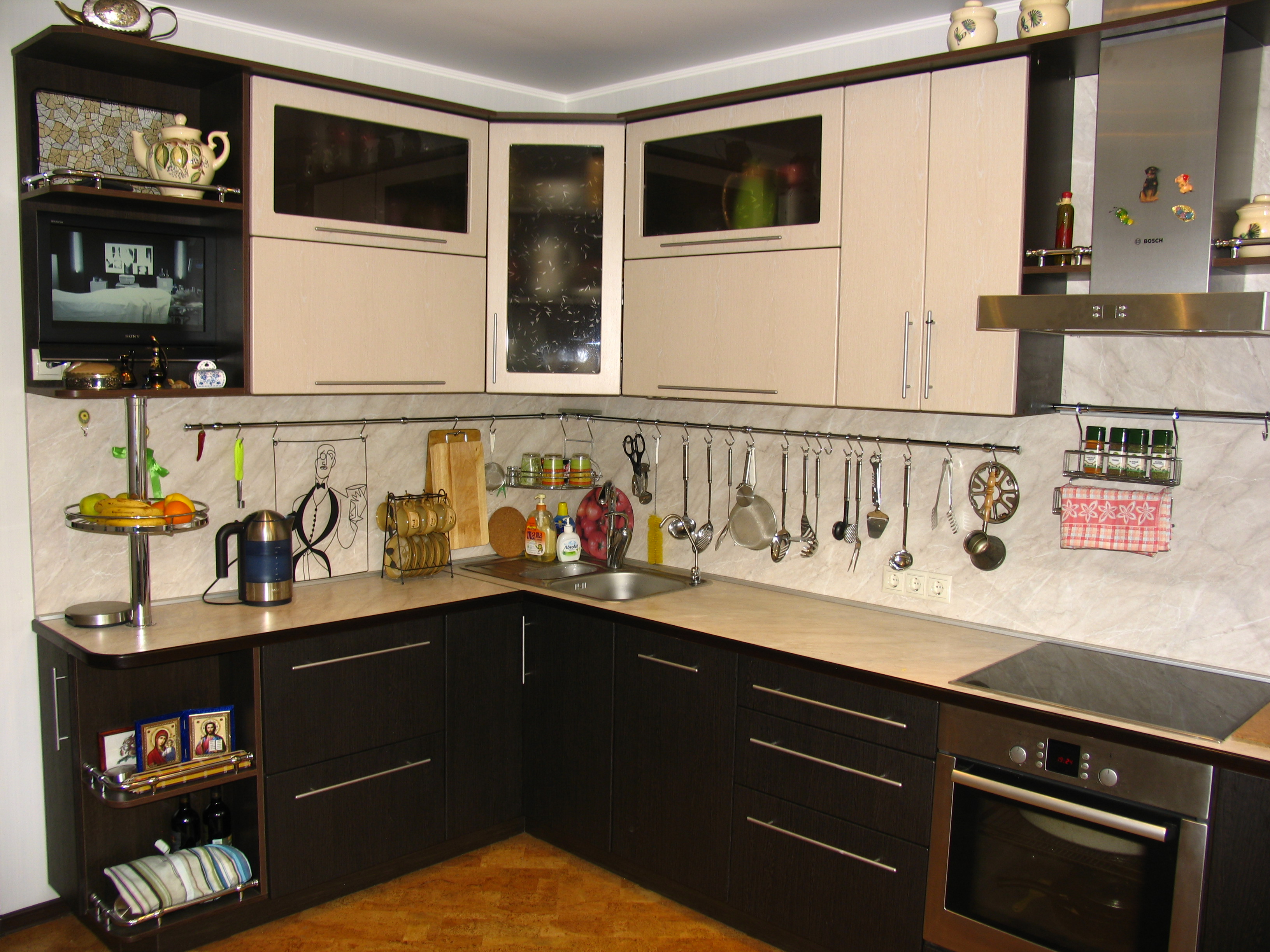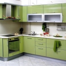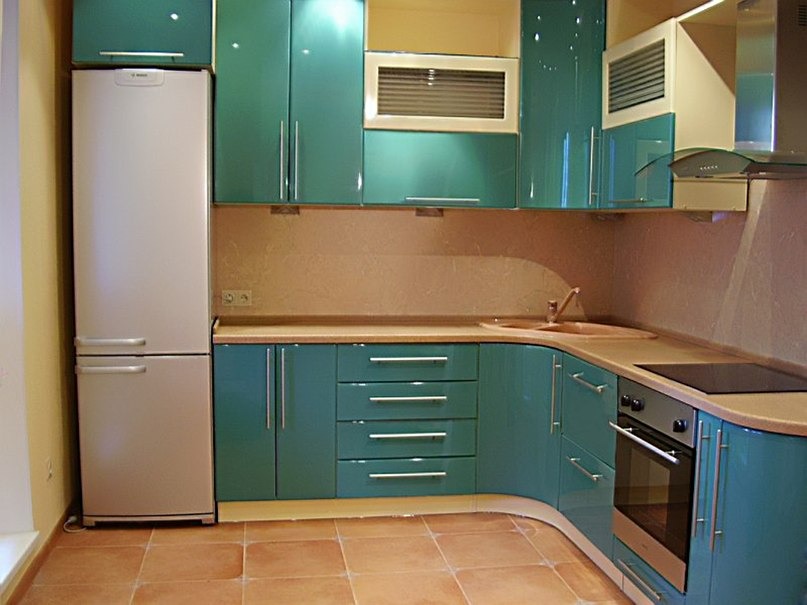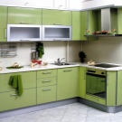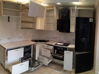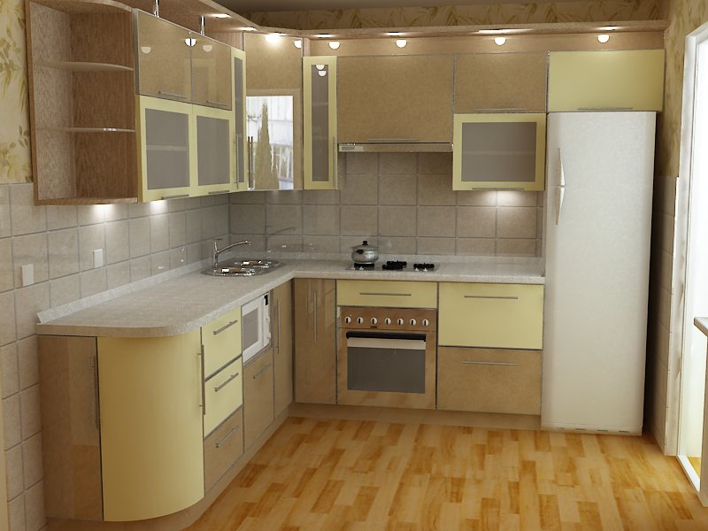 - Wenn Sie einen eckigen Küchenschrank in das Set aufnehmen, erhöht sich die nutzbare Fläche des Raumes. Und Sie können einen solchen Schrank sogar dort platzieren, wo die Installation von Standardmöbeln nicht möglich ist.
