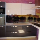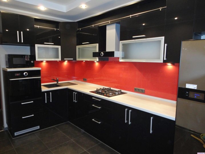 Meistens werden die Schränke von Küchenschränken aus Spanplatten hergestellt, was sich als vorteilhaft erweist, da sich ein solches Material durch seine Festigkeit und Haltbarkeit auszeichnet und nicht schwierig zu pflegen ist. Die Spanplatten, obwohl nicht sehr ästhetisch, sind hinter den Fassaden fast unsichtbar. Aber für die Türen von Küchenecken ist es sinnvoll, ein schönes Design zu wählen, zum Beispiel Glas, Holz, Metall.
