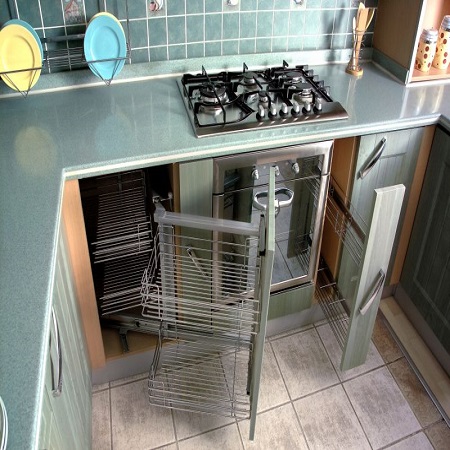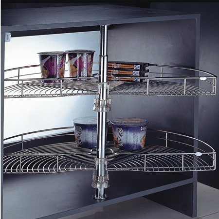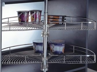 Die am häufigsten verwendete Art von Möbeln für Eckschränke gelten als "Karussell". Dies sind zwei oder mehr runde Regale, die in der Lage sind, freien Zugang zu allen Küchenutensilien in den Regalen zu haben.Solche Karussellregale bestehen aus verschiedenen Materialien, was sehr wichtig für diejenigen ist, die auf kleine Details achten. Sie können den Regal-Kreisverkehr öffnen. Stimme zu, eine ziemlich interessante Option.