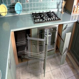 Eine einfachere und bequemere Art von Hardware kann als System mit verschiebbaren Regalen bezeichnet werden. Es bietet einen freieren Zugriff auf alle Elemente, die auf ihnen gespeichert sind. Wenn Sie vor der Aufgabe stehen, den Platz in der Küche zu erhalten, können Sie sich für geräumige Körbe entscheiden. Für Liebhaber der Funktionalität ist die beste Option, Eckkästen zu installieren, mit denen Sie den Raum Ihrer Küche optimal nutzen können.