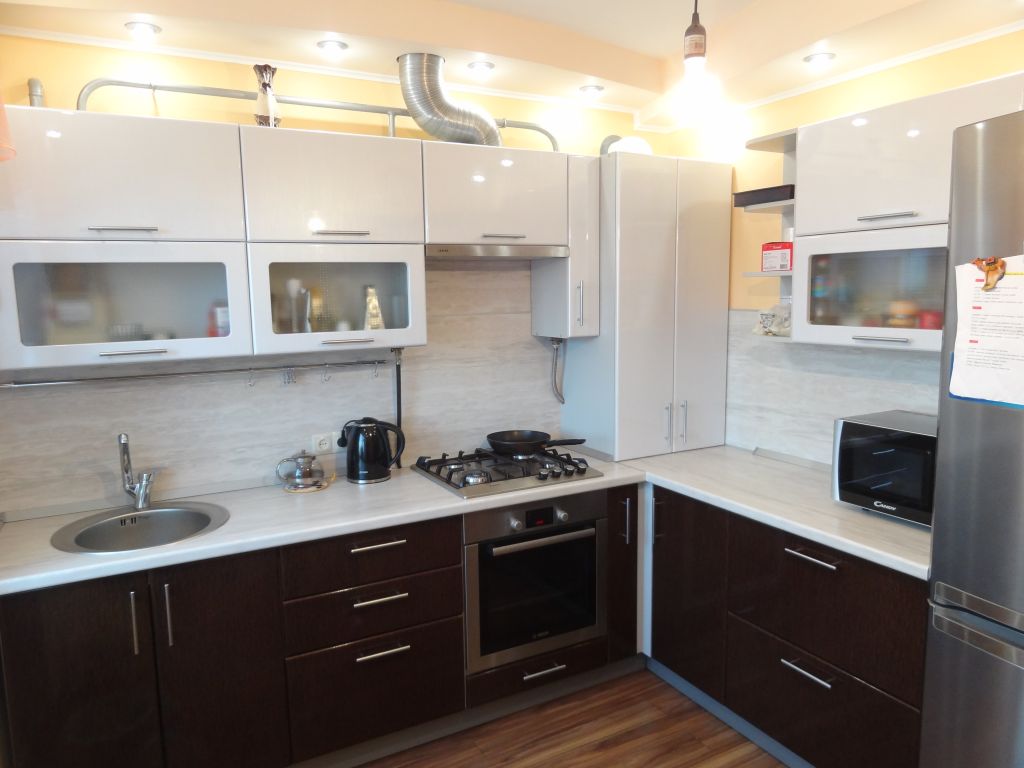 Ganz gut in der Küche werden Schränke aussehen, die in verschiedenen Farben hergestellt werden. Dunklere Farbtöne eignen sich besser für Bodenschränke und leichtere für die oberen. Dies erleichtert den Raum optisch, füllt ihn mit Licht.