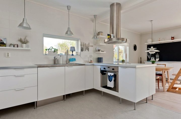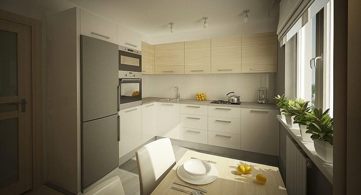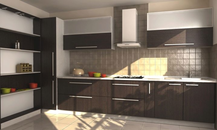 - Die Installation eines Küchenschranks wird nützlich sein, wenn Sie einige der Mängel des Zimmers maskieren müssen;