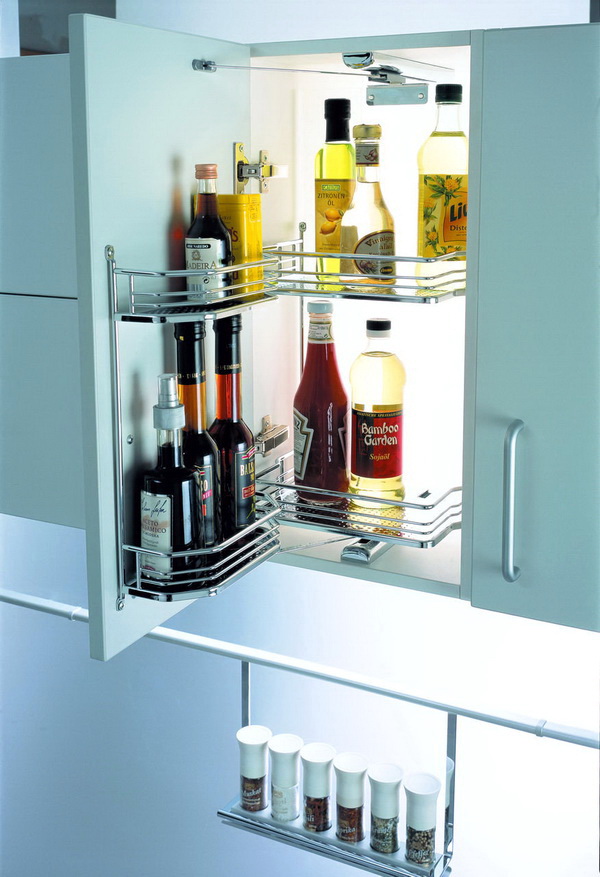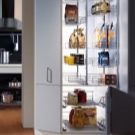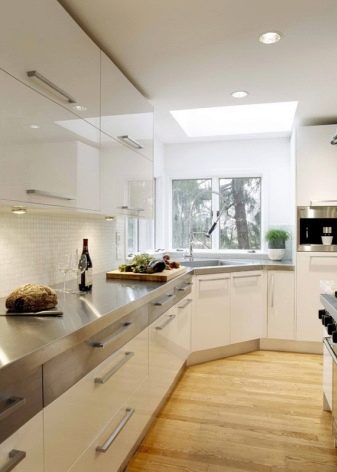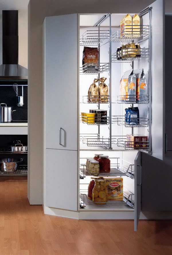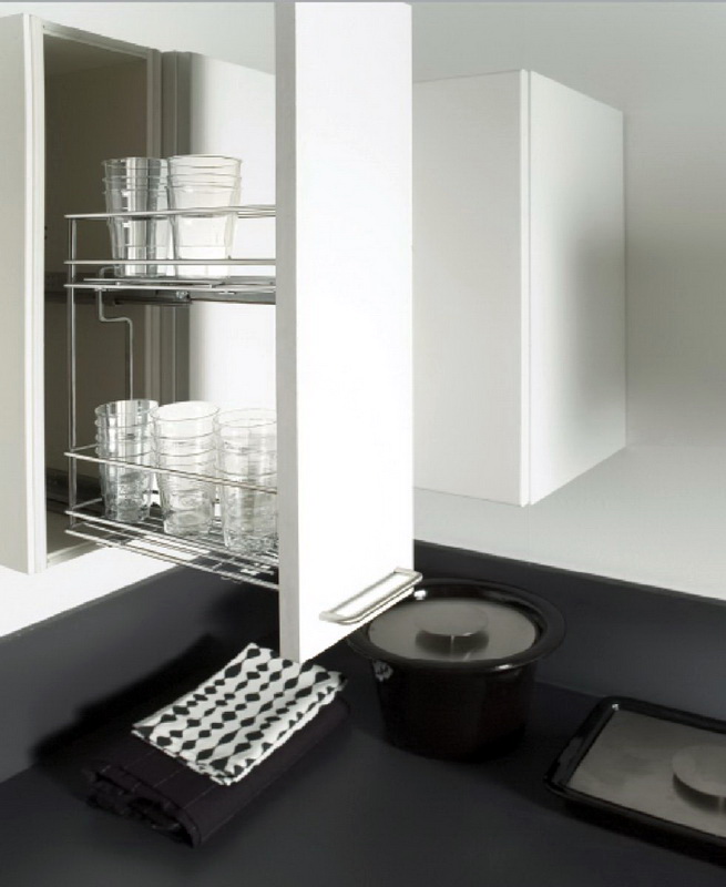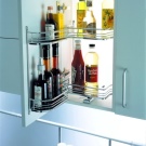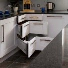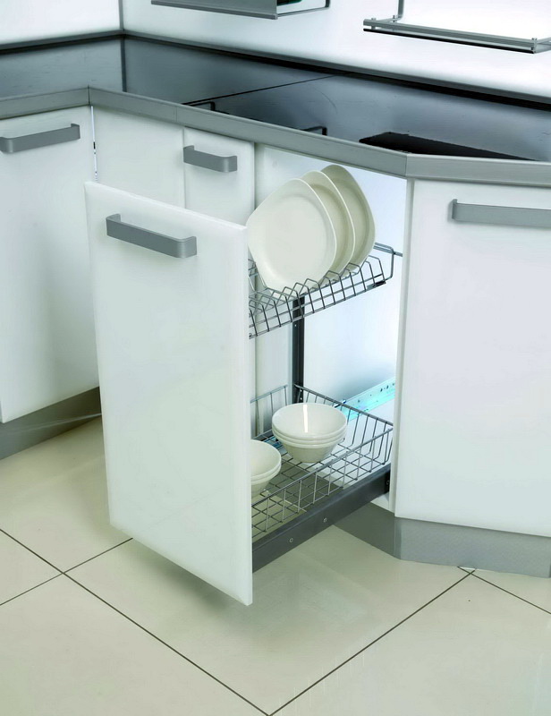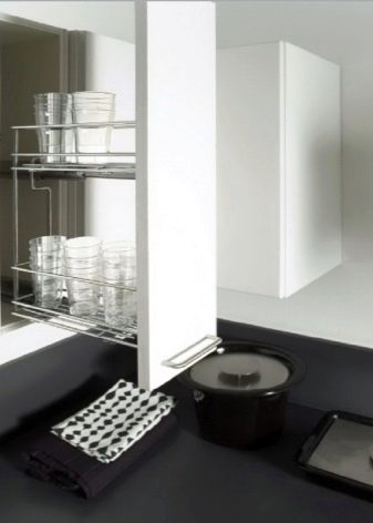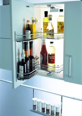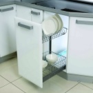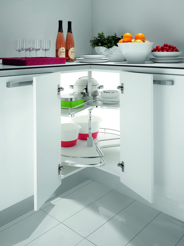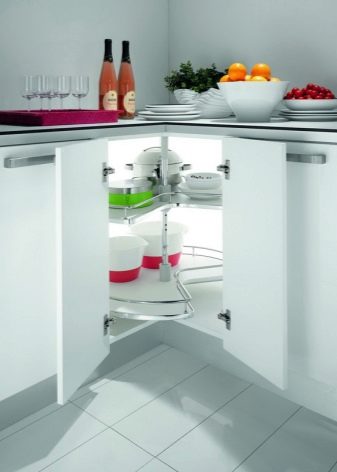 - Eckschränke ermöglichen eine effiziente Nutzung der Küche und werden verwendet, wenn ein Headset an zwei Wänden gleichzeitig platziert wird. Solche Schränke werden mit speziellen Zugangssystemen hergestellt - rotierend, ausfahrbar.