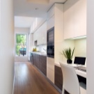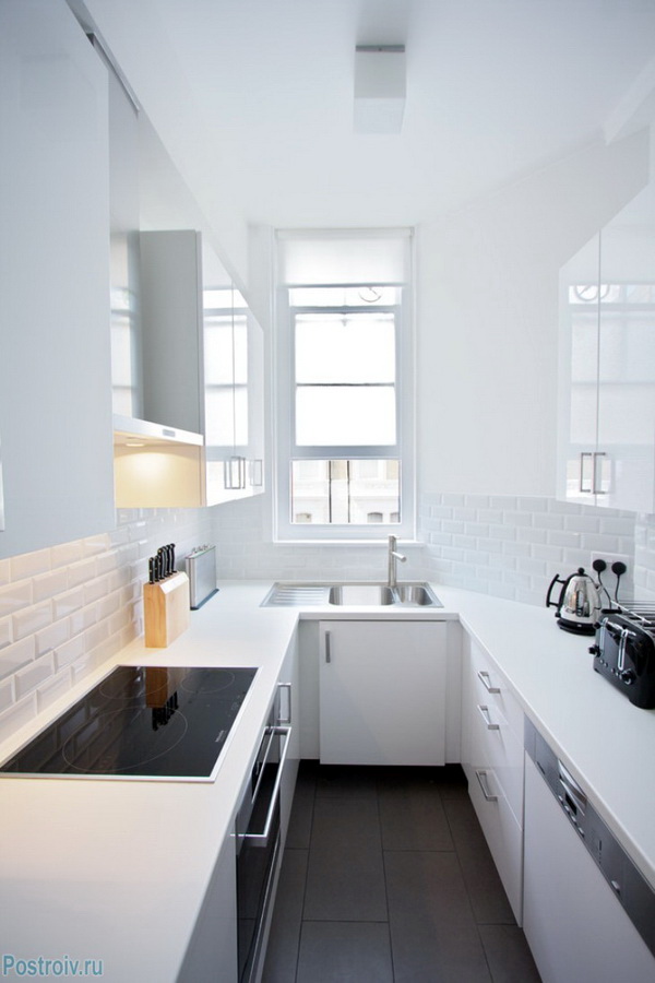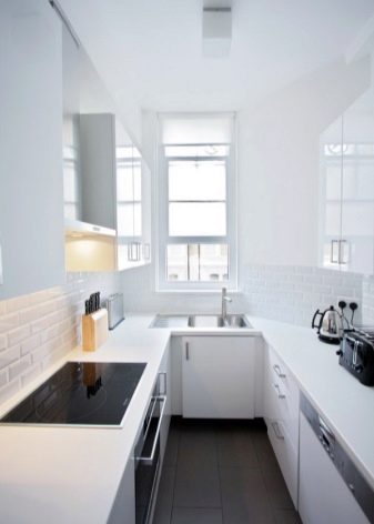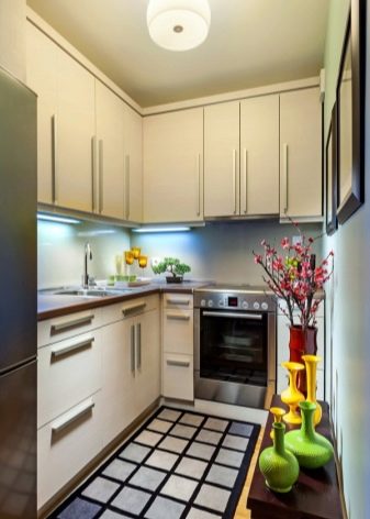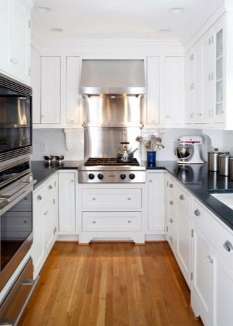 - Mit der Option einer breiten und langen Küche ist es sinnvoll, beide Seiten für eine lineare Anordnung zu verwenden. In diesem Fall befinden sich zwei der drei Eckpunkte des Dreiecks auf derselben Seite und der dritte Eckpunkt auf der gegenüberliegenden Seite. Der Mindestabstand zwischen den Linealen sollte mehr als 120 mm betragen, um eine freie und sichere Bewegung zu gewährleisten.