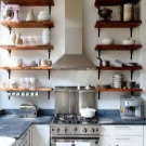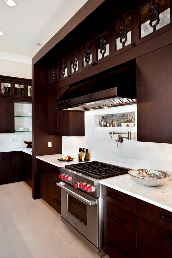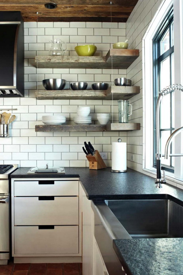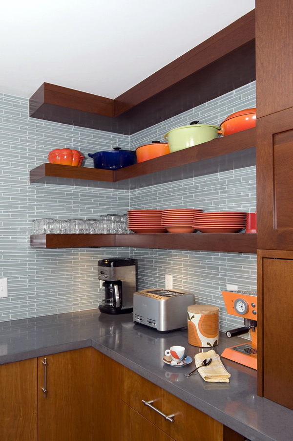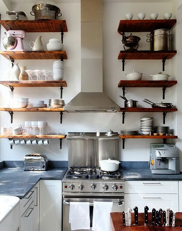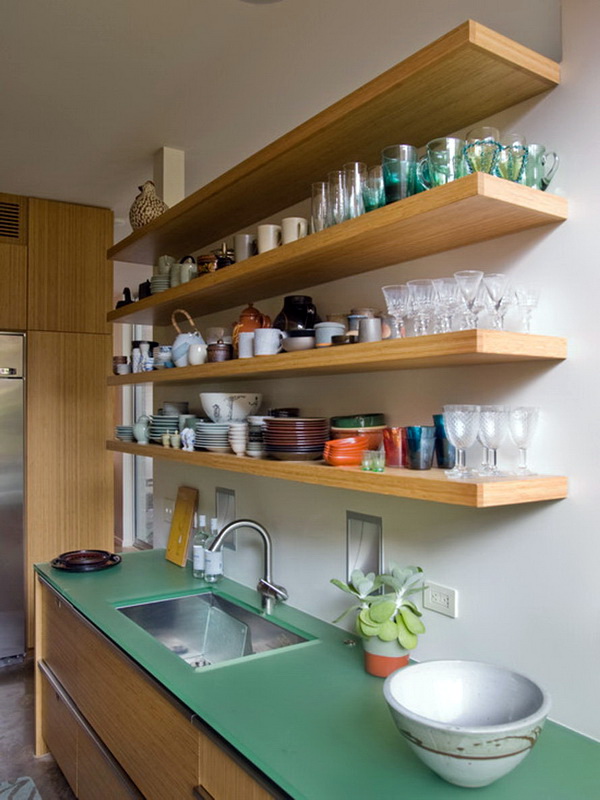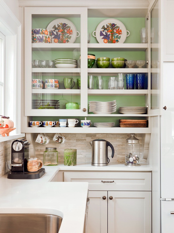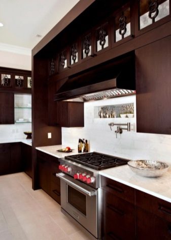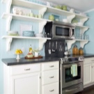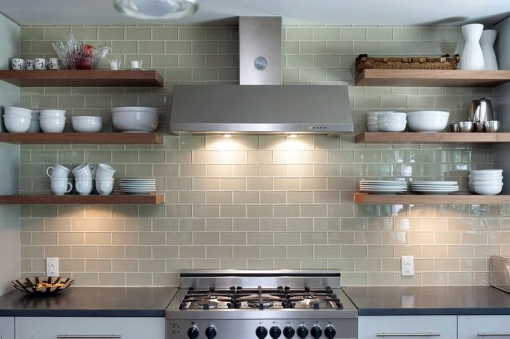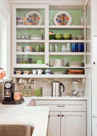 - Wandschränke sind bequemer zum Aufbewahren von Geschirr, Gläsern und Gläsern mit Gewürzen. Offene Schränke ermöglichen es Ihnen, all dies in Form von zusätzlichen Dekorationen ins Innere zu arrangieren.