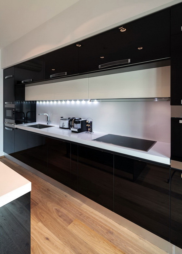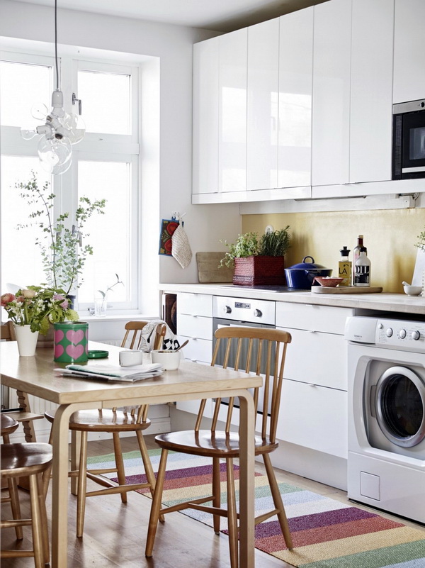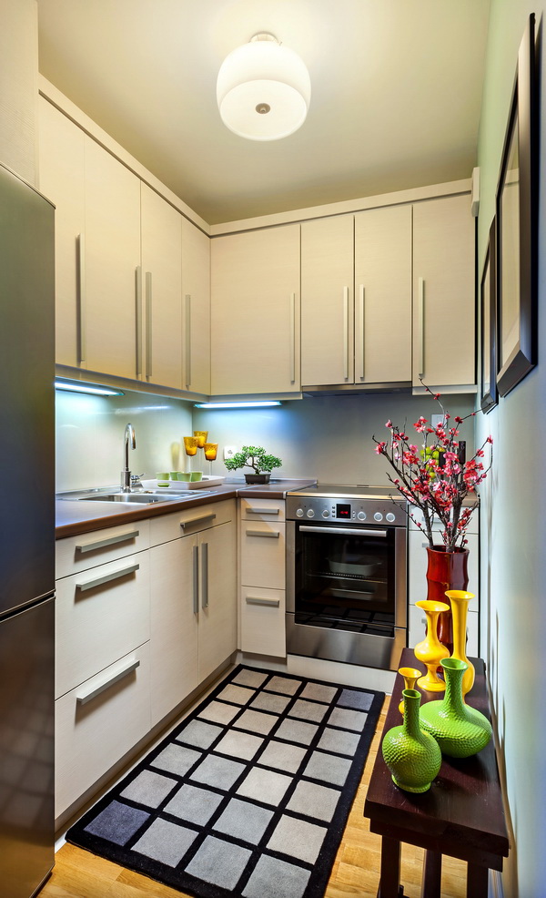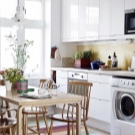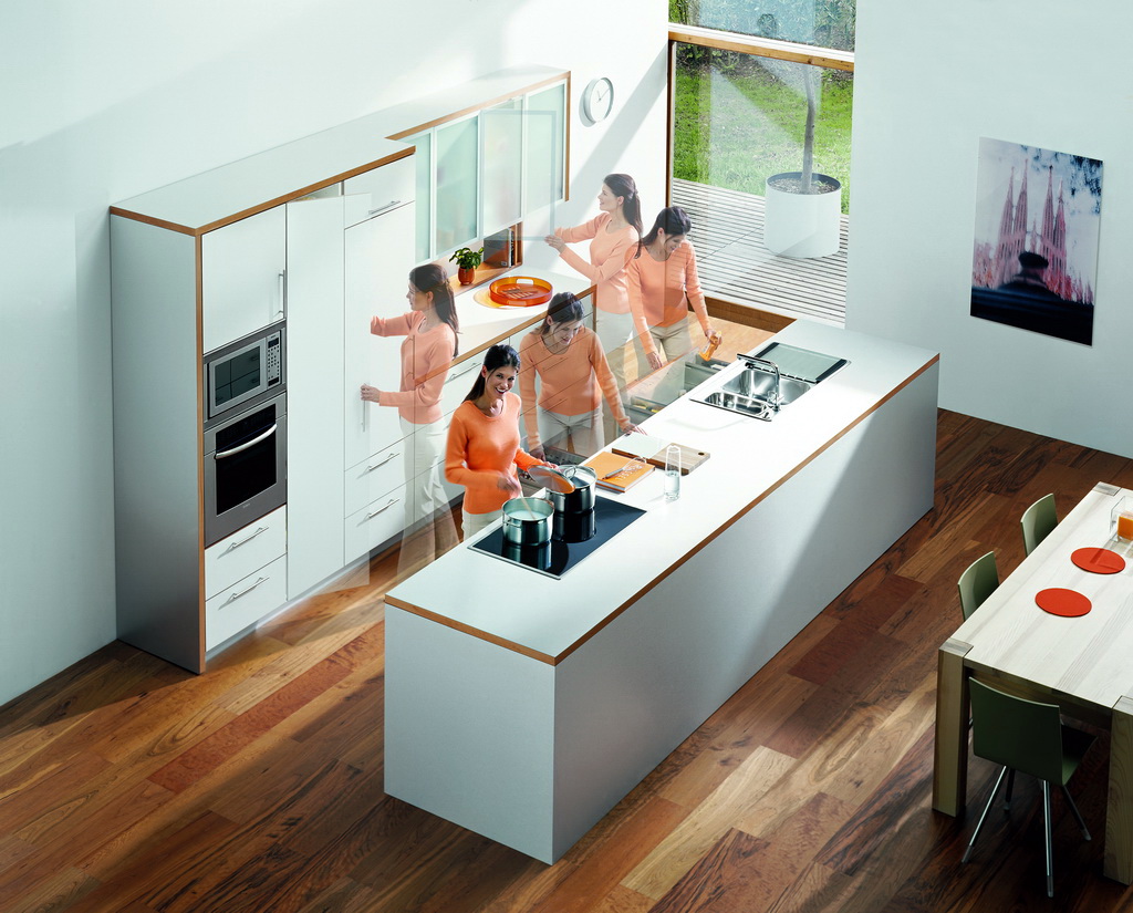 - Alle großformatigen Utensilien befinden sich am besten in den Bodenschränken. Geschirrspüler und Waschmaschinen befinden sich in speziell angepassten Bodenschränken.