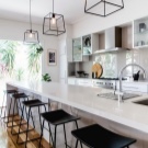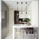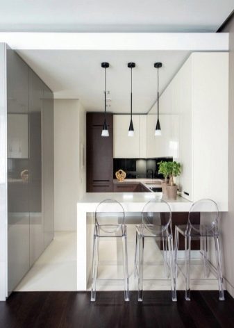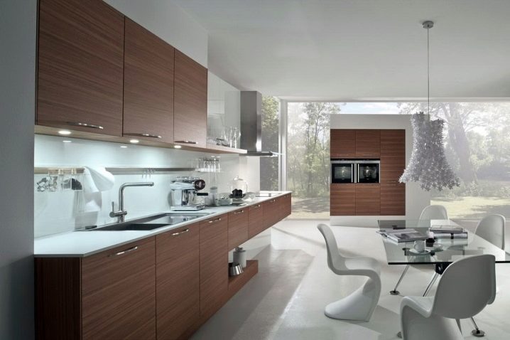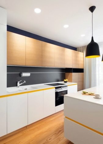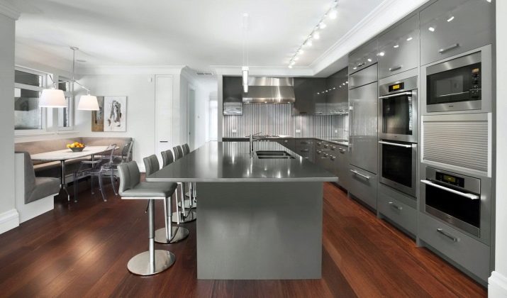 - Für geräumige Küchen ist eine lineare Anordnung von modularen Schränken ziemlich gut, wo Sie eine Spüle und einen Kühlschrank an den Rändern platzieren können, und einen Ofen mit einer Arbeitsfläche in Form einer Insel platzieren. Mit dieser Anordnung können Sie Ihren Arbeitsraum komfortabel organisieren.