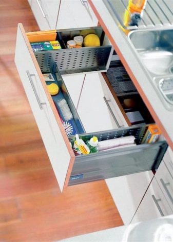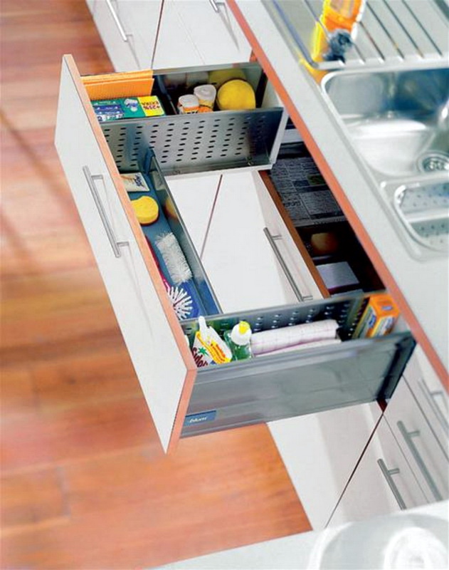 - Im Falle von Metabox-Boxen ist es praktisch, nicht nur große Geschirr und Besteck in den Bodenschränken zu lagern, sondern auch Getreide, Mehl, Zucker und andere Dinge, die ein ziemlich großes Gewicht haben.