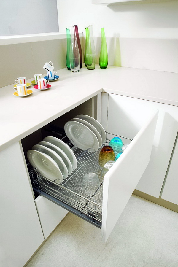 - Es ist nicht wünschenswert, Boxen mit Geräten in Eckschränken zu haben, es wird immer schwierig sein, sie zu bekommen.