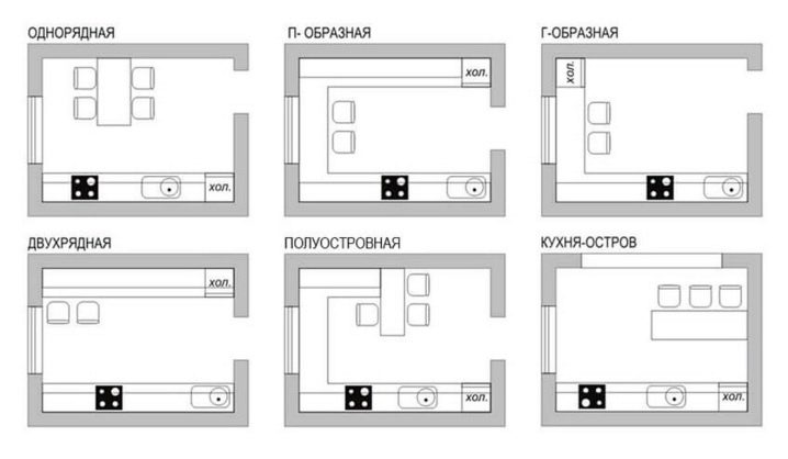Es liegt in der Tatsache, dass die Hauptarbeitsplätze der Küche, wie ein Herd und eine Spüle, ein Kühlschrank und eine Arbeitsfläche, an den Eckpunkten eines Dreiecks liegen, und die Seiten dieses Dreiecks sind Arbeitswege. Um dieser Regel zu entsprechen, gibt es mehrere Optionen für den Standort, abhängig von der Fläche und Form der Küche.