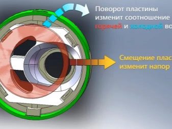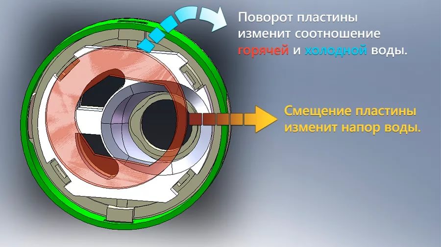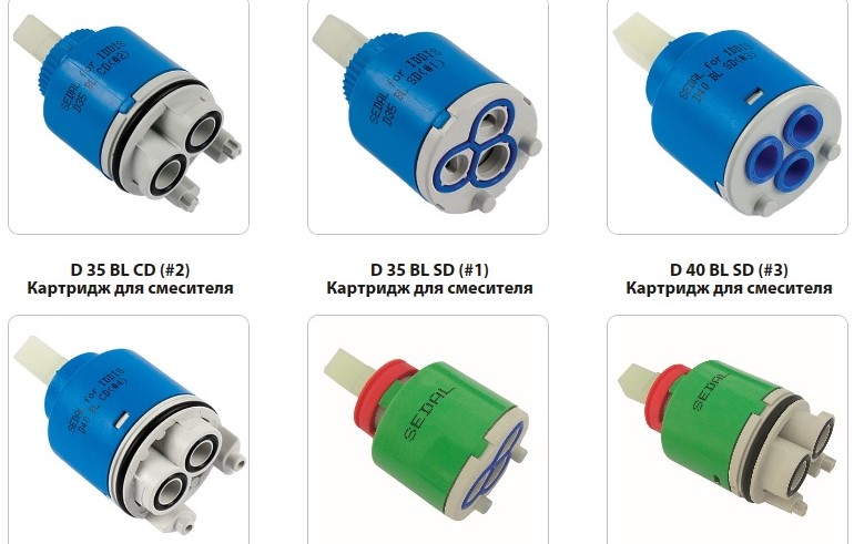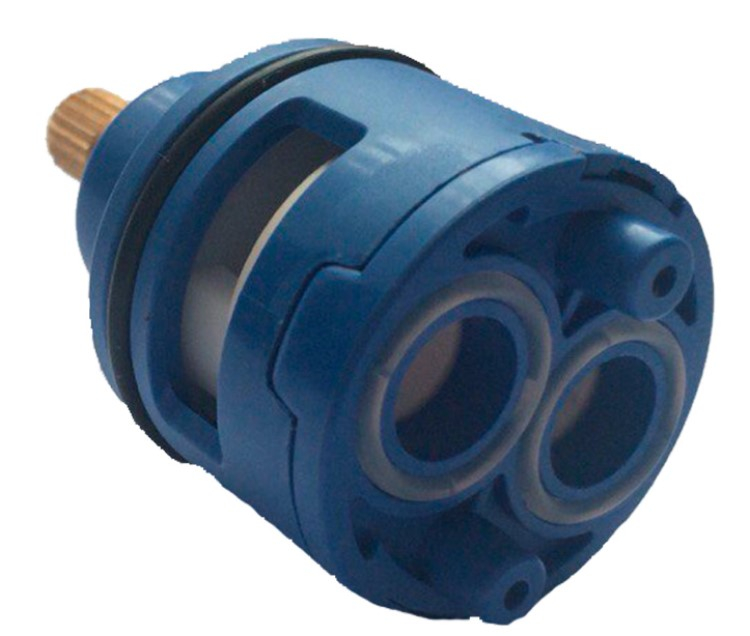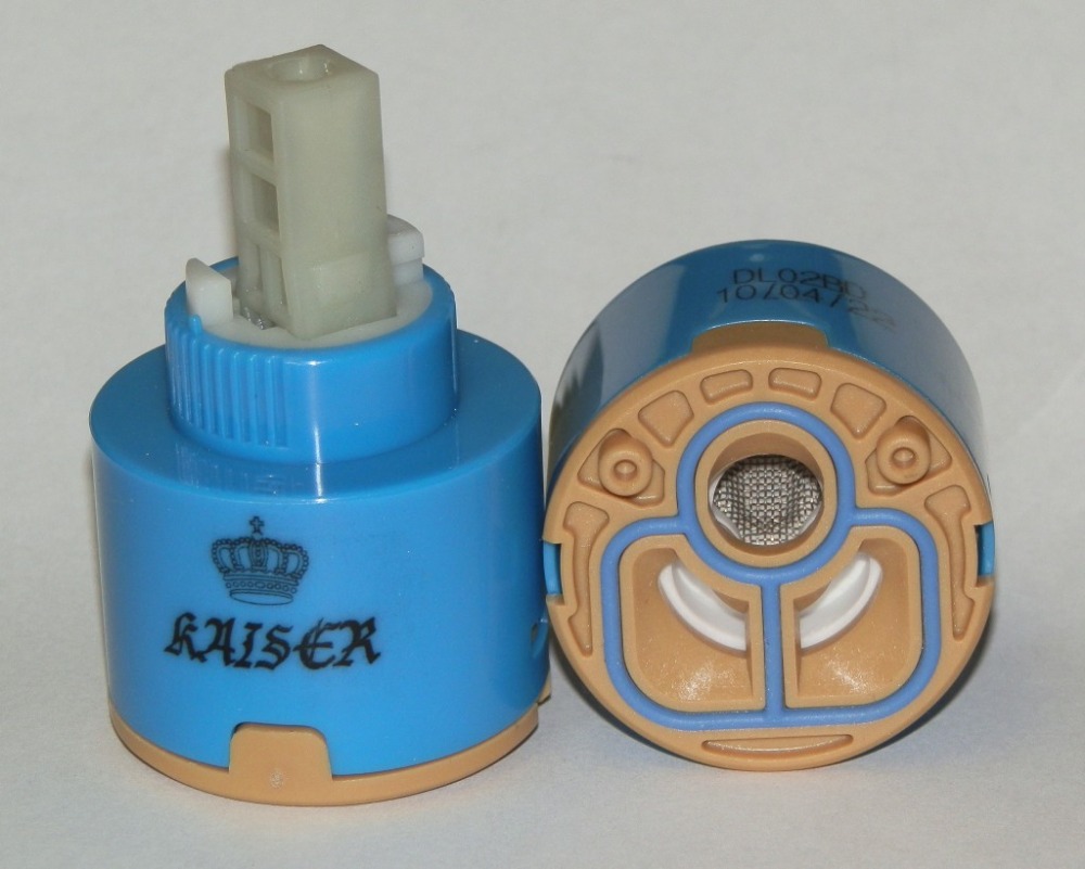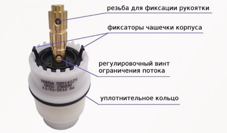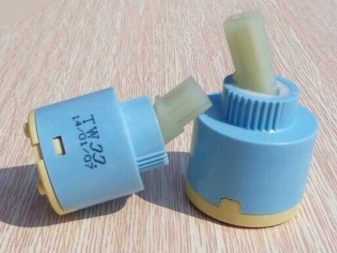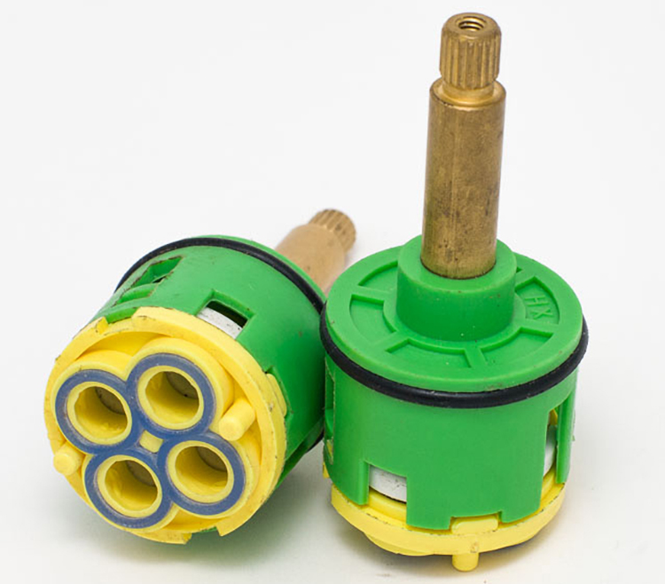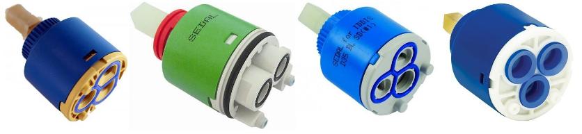 In der Kartusche befindet sich eine Platte, in der sich das Wasser mischt. Wenn die Platte verschoben wird, ändert sich der Druck des Wassers. Anstelle einer Platte kann eine kleine Kugel verwendet werden, die, rollend, das Loch mit heißem Wasser schließt, dann das Loch mit kaltem. Der obere Schaft ist eine Fortsetzung des Krangriffs.Dieser Zylinder ist in jedem Waschbecken oder Badewannenhahn eingebaut.