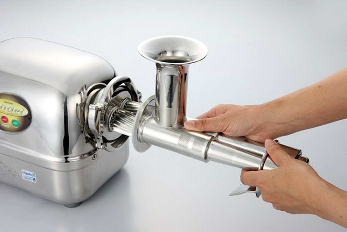 Der Hersteller hat darauf geachtet, das Produkt aus jedem Gemüse Geschenk selbst mit Gruben vorzubereiten, der Saft kann aus frischem Grün, Tannennadeln, Getreide Samen hergestellt werden, wird es helfen, Mandelsaft zu bekommen. Gleichzeitig ist das Gerät so einfach und bequem zu bedienen, dass selbst die unerfahrenste Gastgeberin, die den Entsafter zum ersten Mal benutzt hat, damit zurechtkommt. Das Designmerkmal entfernt alle unnötigen Rückstände in Form von Ölkuchen und liefert nur ein Saftprodukt am Auslass - frei von Verunreinigungen, Samen und Schalen.