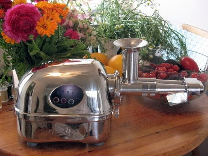 Aber in diesem Modell, das als eines der besten gilt, findet keine Erwärmung statt, ebenso wenig Reibung. Weil das Schneckenmodell die niedrigste Geschwindigkeit der Schleifeinheiten hat - nur zweiundachtzig Umdrehungen in einer Minute. Aufgrund dieser Eigenschaft verliert der Saft seinen Vitaminwert nicht, er bleibt "am Leben" und ist daher sehr nützlich.