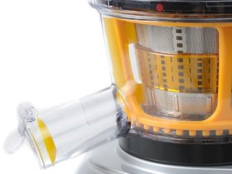 Als nächstes müssen Sie sicher, bis der Mechanismus klickt, die Schüssel, den Filter und die Schnecke befestigen, nach denen Sie direkt fortfahren können, um den Saft zu drücken.