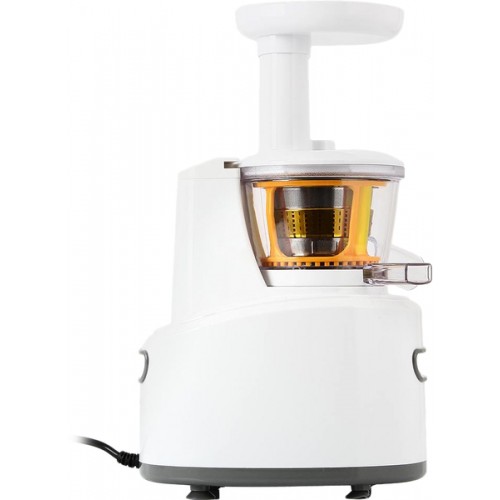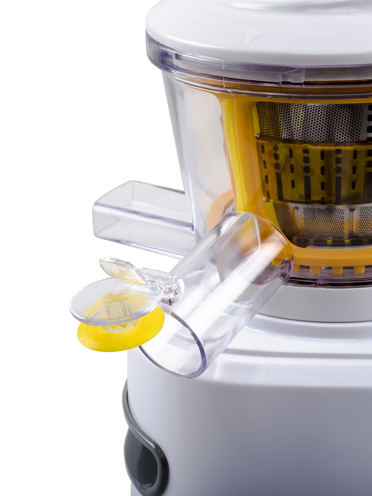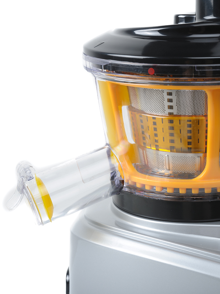 Niedrige Geschwindigkeiten beeinflussen die Qualität des Saftes - er erhitzt und oxidiert noch weniger und seine wohltuenden Eigenschaften, Vitamine und Spurenelemente sind besser erhalten. Der Kuchen bleibt auch bei der Arbeit mit Tomaten oder frischen Kräutern trocken.
