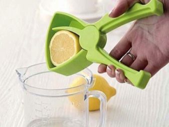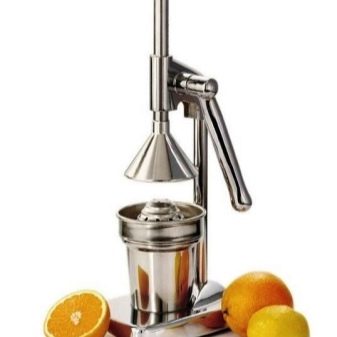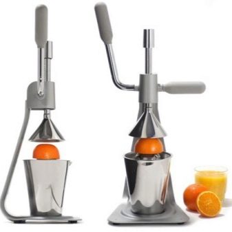 Eine andere Art von Presssaft-Entsafter besteht aus zwei Platten, zwischen denen Fruchtscheiben angeordnet sind. Der Mechanismus wird durch Drehen der Schraube in Bewegung gesetzt. Durch die Löcher in der Bodenplatte gelangt der Saft in einen speziellen Tank. Diese Modifikation ermöglicht es, mehr Früchte gleichzeitig zu verarbeiten und eignet sich nicht nur für Zitrusfrüchte, sondern auch für Äpfel, Beeren, Tomaten und andere Gemüse und Früchte.