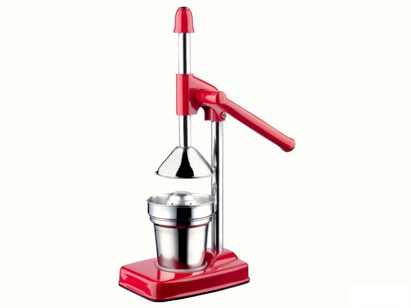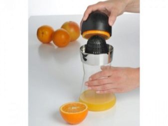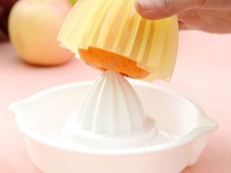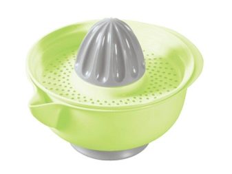 Der erste Typ ist der einfachste. Es besteht aus einer kegelförmigen Filterdüse und einer Saftschale. Es genügt, die Frucht zu schneiden, die Hälfte auf den Kegel zu drücken und leicht zu scrollen. Für ein Glas Getränk brauchen Sie zwei mittlere Früchte. Praktisch im täglichen Gebrauch, einfaches Design, braucht nicht viel Platz.