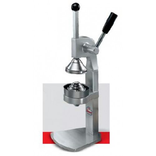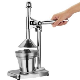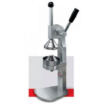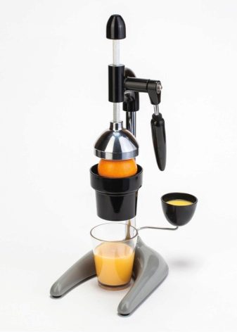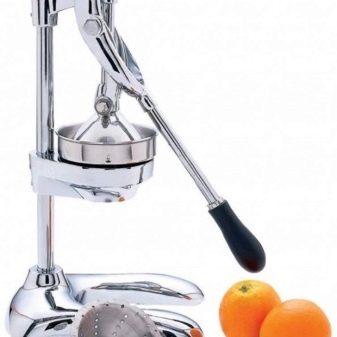 Das mechanische Modell der Pressdrehung hat einen Hebel, der am Rahmen befestigt ist. Die Hälfte der Früchte befindet sich zwischen zwei Zapfen. Mit Hilfe eines Hebels wird die Presse aktiviert und beginnt, die Frucht zu quetschen, der Saft tritt durch die Löcher im unteren Kegel in die Schüssel ein.Sie erhalten den Saft ohne viel Aufwand.