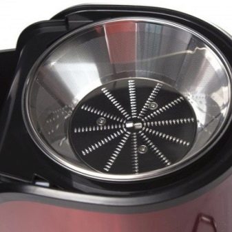 Die Form des Entsafters spielt auch eine wichtige Rolle für die Produktivität. Es gibt Geräte mit zylindrischer, konischer oder sphärischer Form. Die zylindrische Form ist gut, weil sie letztendlich ein größeres Volumen an fertigem Saft erzeugt. Obwohl diese Probe nicht die Möglichkeit bietet, den Kuchen zu trennen. Der konisch geformte Entsafter trennt automatisch die Pulpeflüssigkeit und das ausgegebene Getränk ist transparent. Der Nachteil hierbei ist das häufige Verstopfen des Siebes durch den Kuchen, so dass es manchmal während des Betriebs erforderlich ist, das Gerät mehr als einmal anzuhalten, zu zerlegen, zu waschen und Zeit zu verlieren.