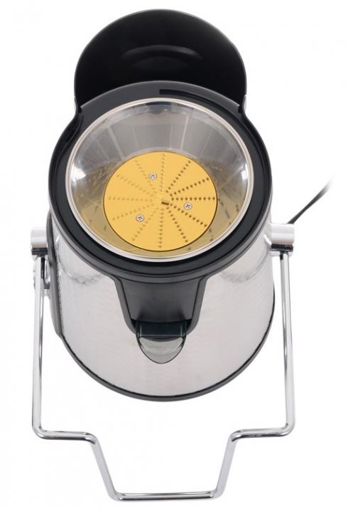 Zuallererst zieht das Modell das Auge mit heller Farbe und stilvollem Design an. Die Leistung beträgt 1000 Watt, 2-Gang-Modus. Der Entsafter hat eine sehr bequeme Kehlbreite von 7,5 cm, mit der Sie große Früchte ganz füllen können. Der Filter besteht aus Titanlegierung, der Körper besteht aus Stahl, was die Haltbarkeit des Gerätes anzeigt. Es gibt eine Funktion "Stop - Drop". Der Preis des Entsafters beträgt etwa fünftausend Rubel.