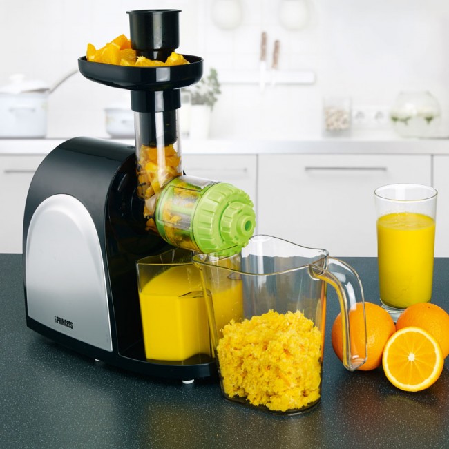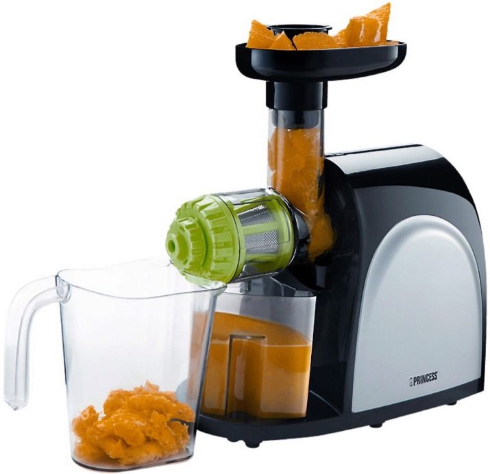 Zum Beispiel wirkt die Horizontalschneckenvorrichtung des niederländischen Herstellers Princess, indem der Saft mit Hilfe einer Schraube und eines Metallfilters mit einem feinen Netz gequetscht wird. Diese Schnecke rotiert, drückt Obst- und Gemüsestücke und wirft sie dann auf eine Filtervorrichtung, durch die der entstehende Saft fließt. Diese Squeezer Saft Marke Princess besteht aus der Motor-Abteilung, Hals-Teil, Schnecke, Filter, Saft Deckel, Kofferraum, Drücker, Behälter zum Sammeln von Saft und Zellstoff, sowie Bürsten für die Reinigung. Um das Funktionsprinzip dieses Geräts zu verstehen, hat der Hersteller Anweisungen zur Verwendung des Entsafters beigefügt.