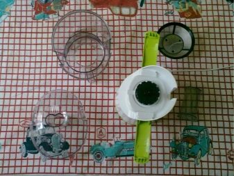 - Und schließlich erhalten Sie Zugang zu dem Behälter, in den der fertige Saft abgelassen wird, und zum Filter. Nehmen Sie sie vorsichtig heraus, um nichts zu beschädigen.Achten Sie besonders auf den Filter - er ist sehr scharf und leicht zu schneiden.