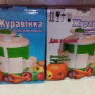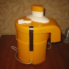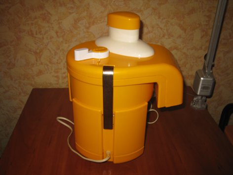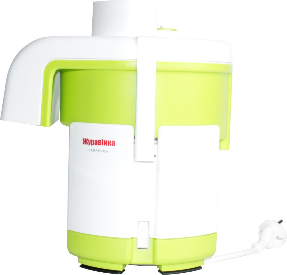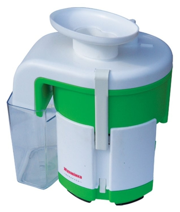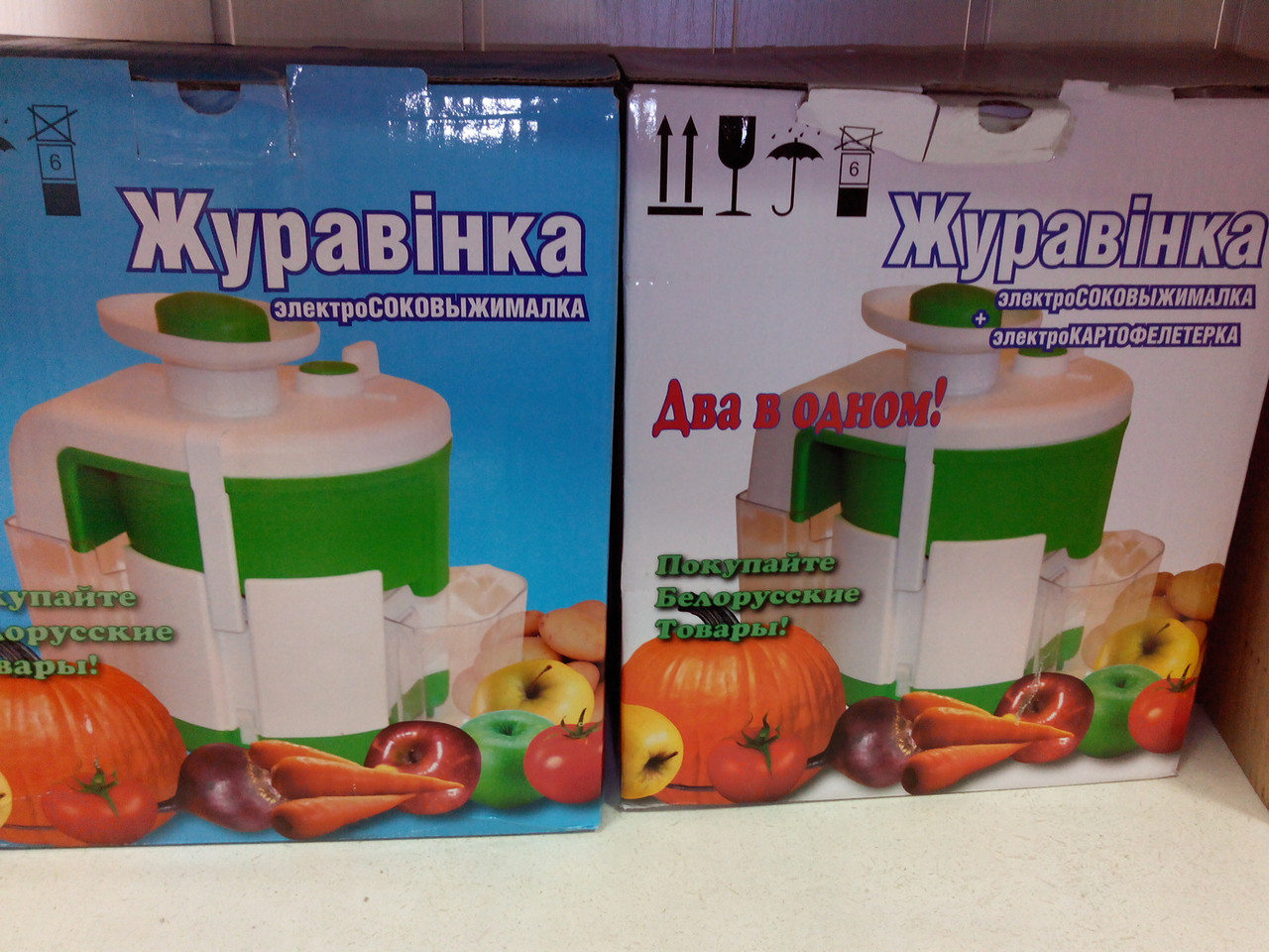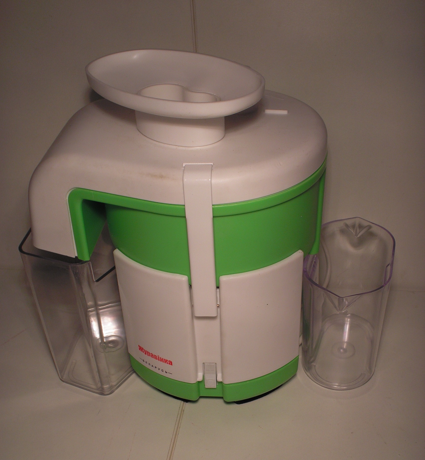 Saftpresse "Zhuravlinka" produziert in Weißrussland. Zusammen mit den anderen elektrischen Entsaftern gilt es als universelles Gerät, das in kurzer Zeit den Saft aus jedem Gemüse und Obst herauspressen kann. Es bewältigt seine Aufgabe unabhängig von der Härte des Produktes.