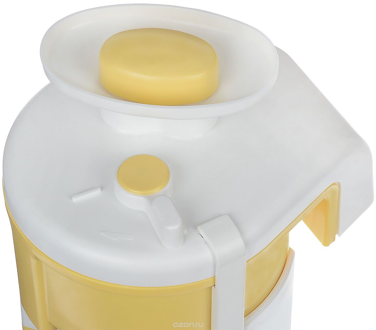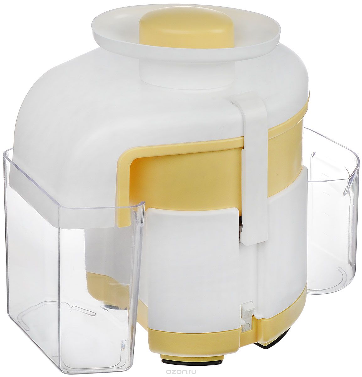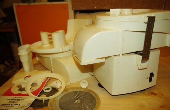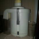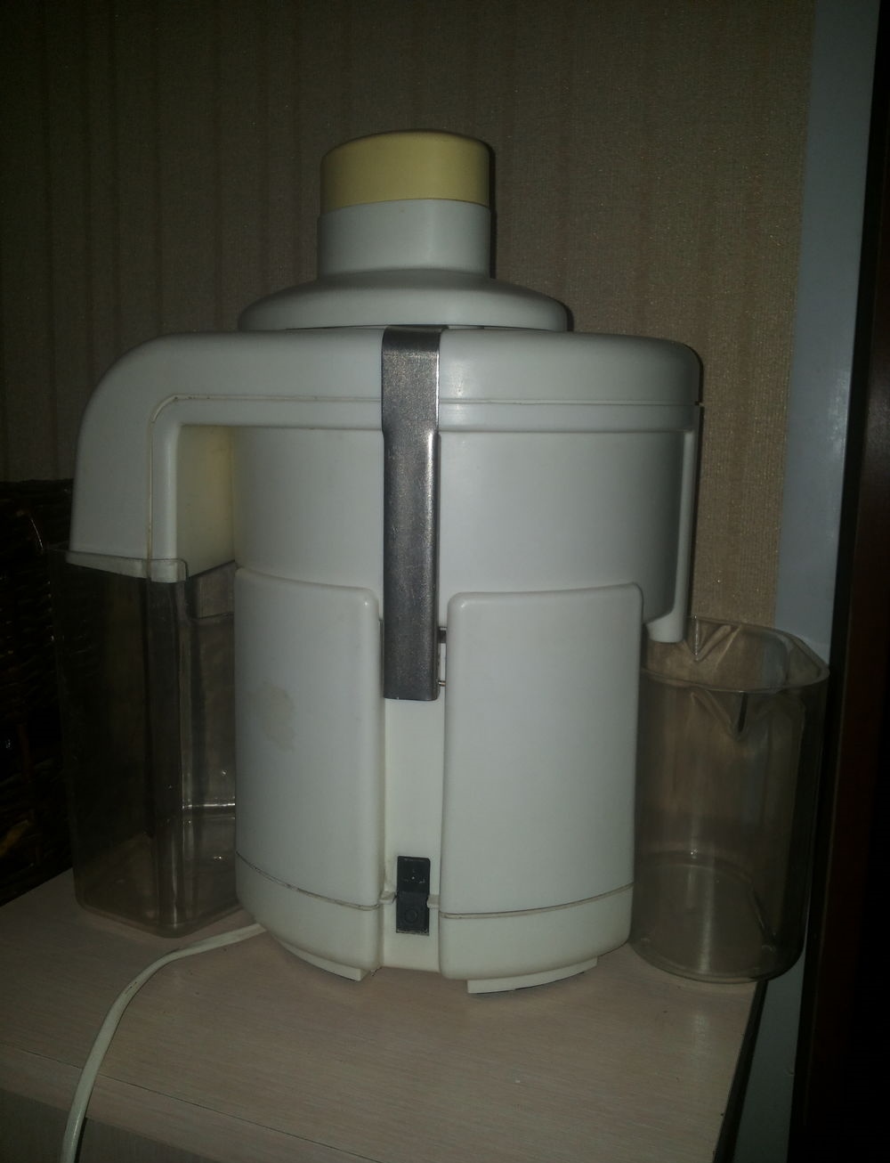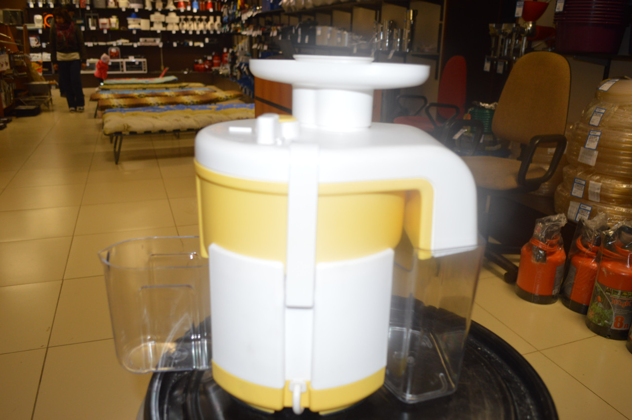 Saftpresse "Zhuravlinka" produziert in Weißrussland. Zusammen mit den anderen elektrischen Entsaftern gilt es als universelles Gerät, das in kurzer Zeit den Saft aus jedem Gemüse und Obst herauspressen kann. Es bewältigt seine Aufgabe unabhängig von der Härte des Produktes.