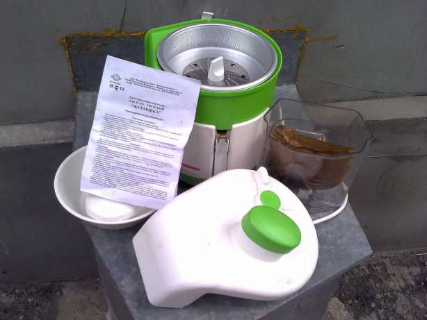 Entsafter "Zhuravlinka" nannte Universalgeräte, weil sie in der Lage sind, irgendwelche Gemüse- oder Fruchtprodukte zu verarbeiten. Das Mahlen in den kascheobrasnyj Zustand geschieht infolge der Reibscheibe, wonach der Saft in der Zentrifuge abgeschieden wird. Nach dem Abquetschen verbleibt eine große Menge Zellstoff, der mit Hilfe eines Pulpenziehers in einen speziellen Behälter gegeben wird.