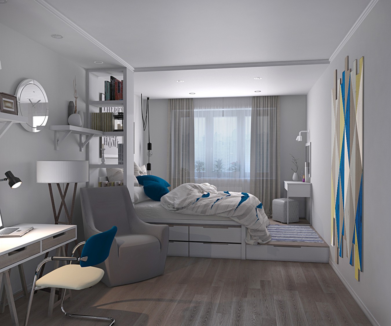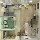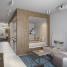 Bei dieser Zoneneinteilung ist es besser, keine dunklen Töne zu verwenden, da sie den bereits kleinen Bereich des Studio-Apartments verbergen.