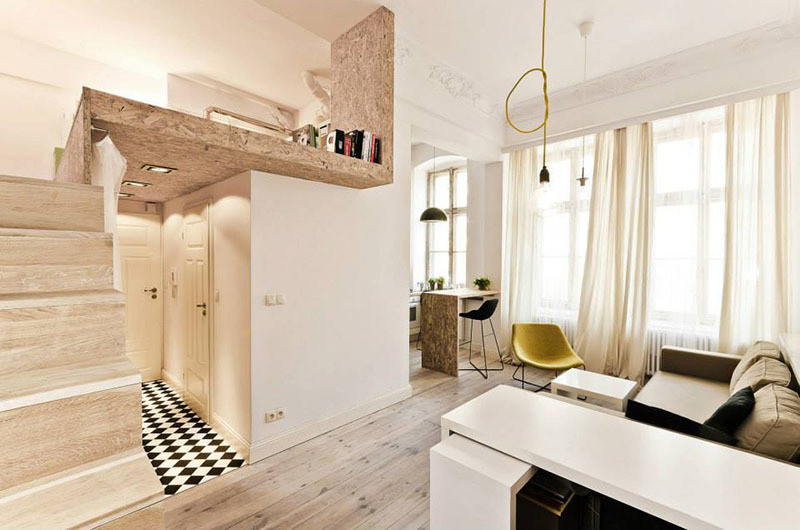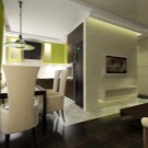 Eine weitere interessante Zonierungsoption ist die Schaffung einer zweistöckigen Decke und einer zweistöckigen Etage, bei der es sich um eine normale Etage mit einer kleinen Erhöhung in einer der Zonen handelt. Aber diese Option ist sehr teuer, so dass Designer eine Budget-Option anbieten - die Trennung von einem kleinen Haus oder Studio-Apartment mit Baumaterialien in verschiedenen Farben.Die Hauptsache ist die richtige Auswahl der Kombination von Tönen. Richtig gewählte Farben können zu einer optischen Raumerweiterung beitragen.